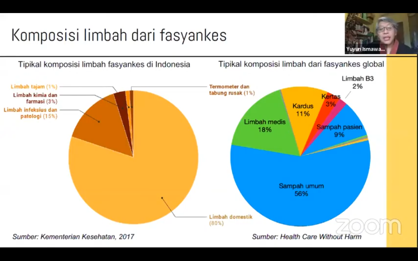 Dari pengalamannya, tak mudah akses komposisi limbah medis ini. Yuyun memaparkan, komposisi limbah dari faskes global (sumber: Health Care Without Harm) didominasi sampah umum 56%, kemudian limbah medis 18%, kardus 11%, sampah pasien 9%, B3 sekitar 2%, dan lainnya. Sementara dari data Kemenkes pada 2017, di Indonesia, pengelompokkannya agak berbeda, didominasi limbah domestik 80%, infeksius dan patologi 15%, kimia dan farmasi 3%, termometer dan tabung serta benda tajam masing-masing 1%.