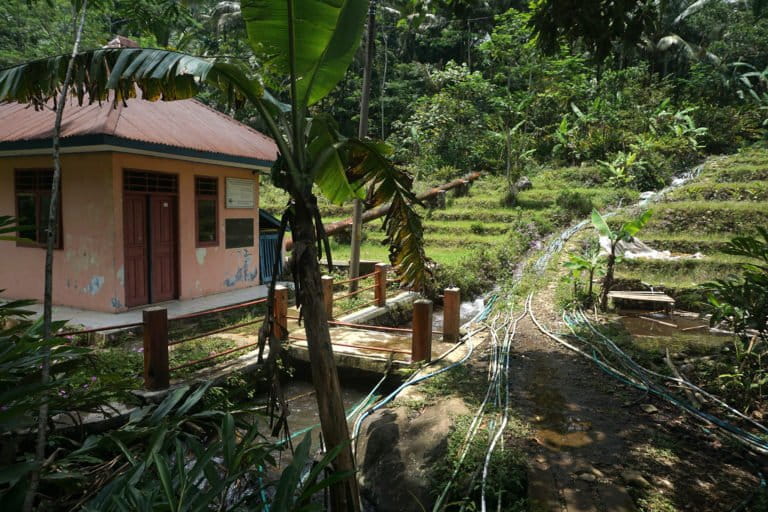 Untuk menggerakkan turbin PLTMH ini, mereka membendung sungai di hutan agar gerak air dari bendungan itu bisa lebih deras untuk menghasilkan listrik. Mulai dari menggali bebatuan untuk membendung sungai di hutan hingga sampai pada membuat instalasi listrik menuju rumah-rumah sepanjang 1,7 km dengan tiang kayu.