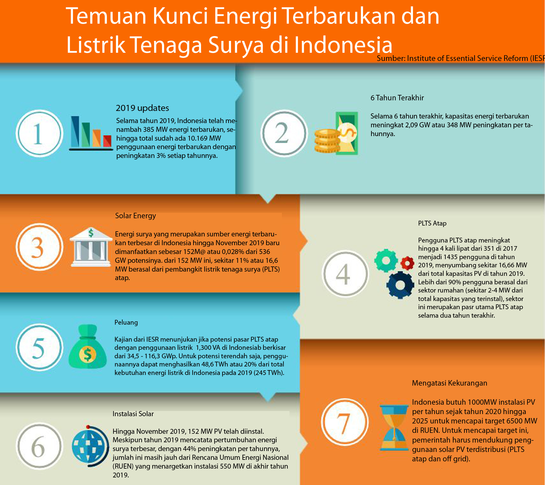 Berdasarkan catatan IESR, PV merupakan sumber energi terbarukan yang potensial di Indonesia. Secara keseluruhan sudah ada 152 MW PV terinstal hingga November 2019, baik skala rumahan, bisnis maupun pembangkit skala besar.