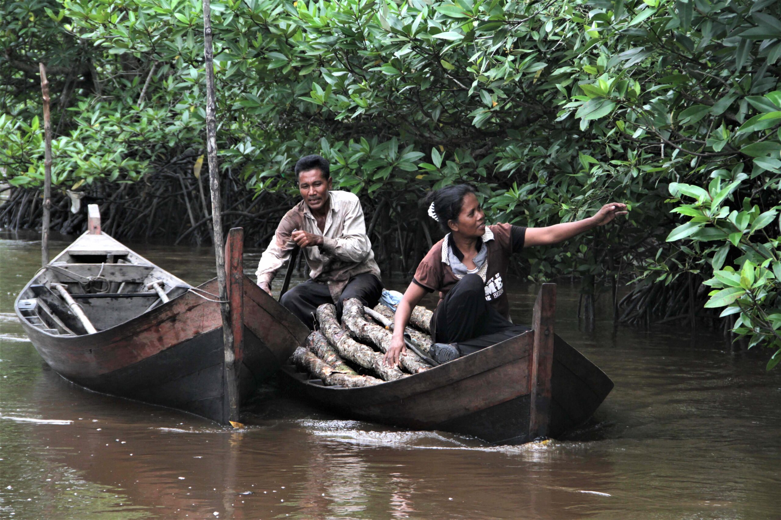 Tidak berselang lama, tampak pasangan suami-istri mengemudikan perahu yang serupa dengan membawa kayu, muncul di balik rerimbunan pohon bakau yang masih tegak berdiri. Berbekal dayung yang terbuat dari bahan kayu, mereka begitu lihai menyusuri anak Sungai Liong.