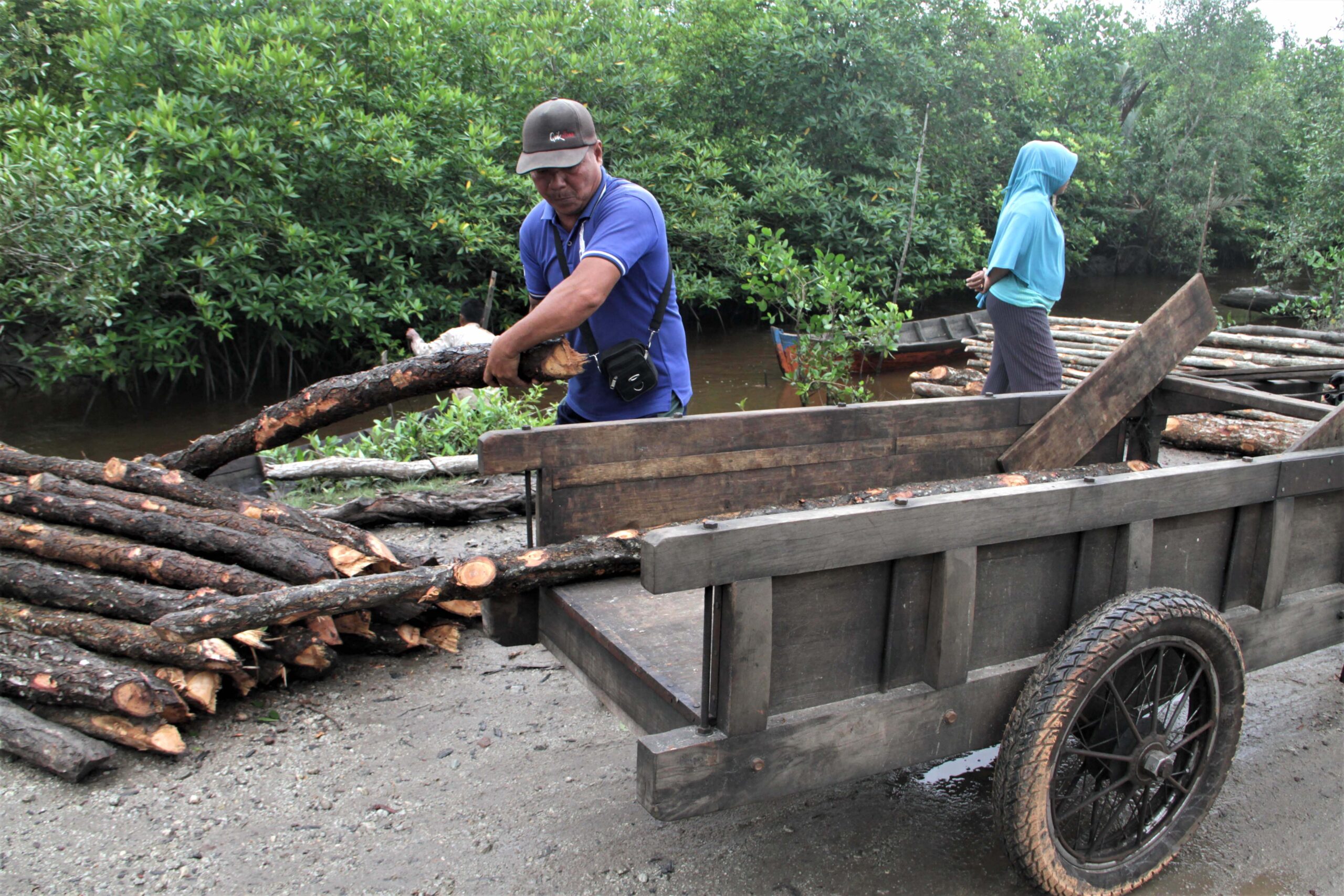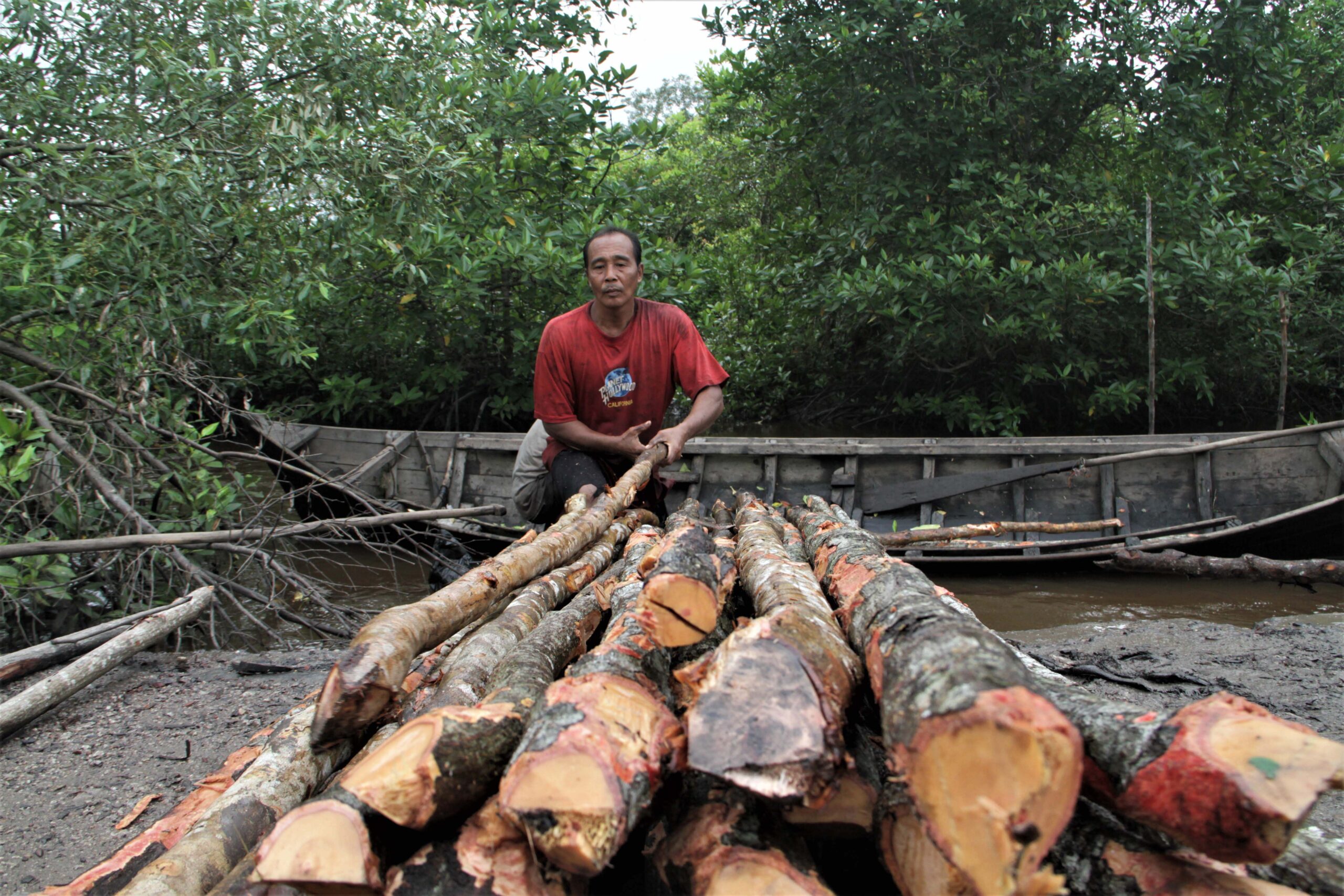 - Proses mencari kayu dengan nama ilmiah Rhizopora apiculata ini tidak mudah, kadang harus masuk ke anak-anak sungai untuk memilih yang layak untuk ditebang.