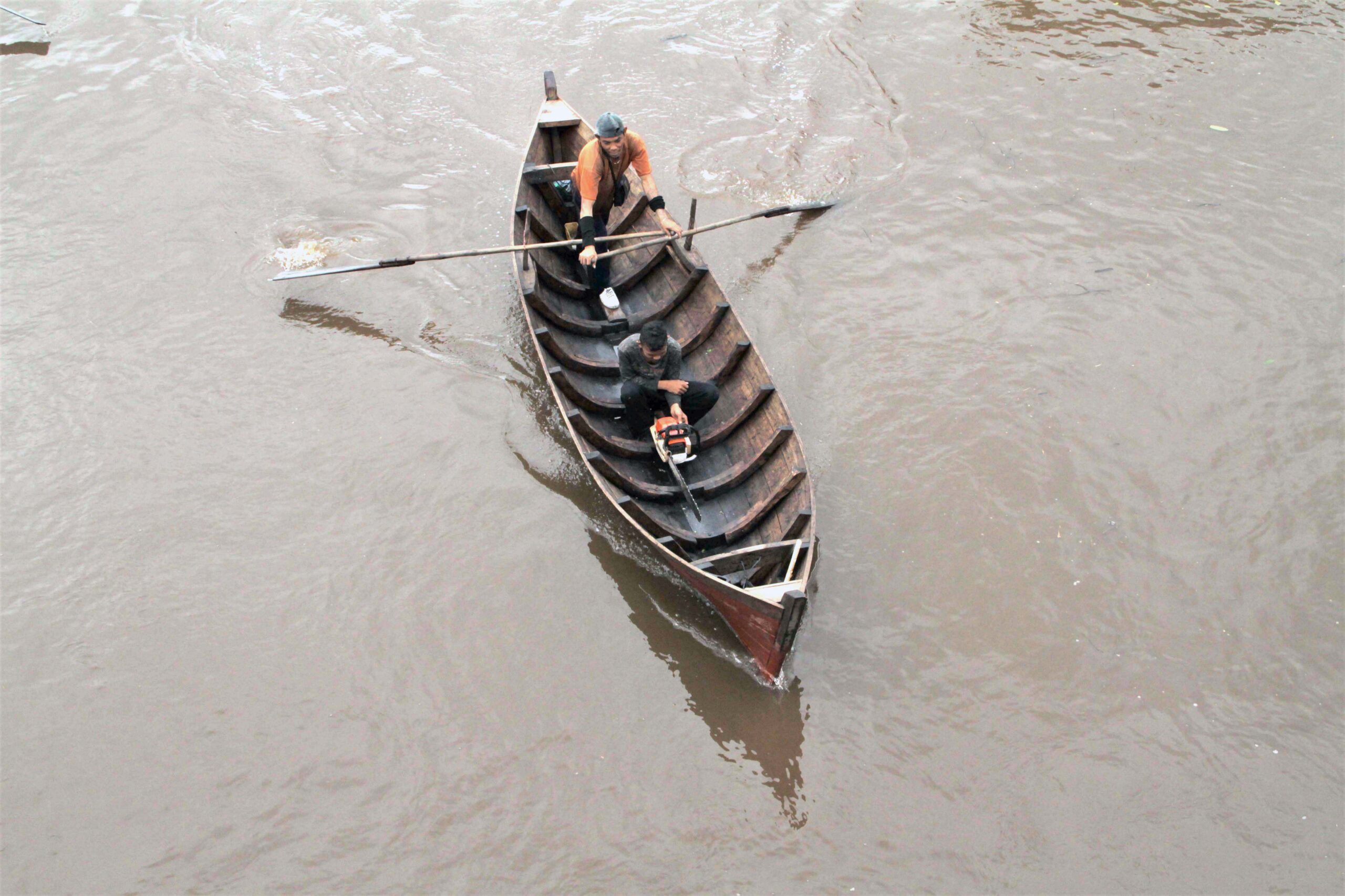 Sudut lain, hadir dua pemuda mengemudikan perahu yang sama. Kali ini perahunya hanya berisi mesin pemotong kayu melintas di bawah jembatan.