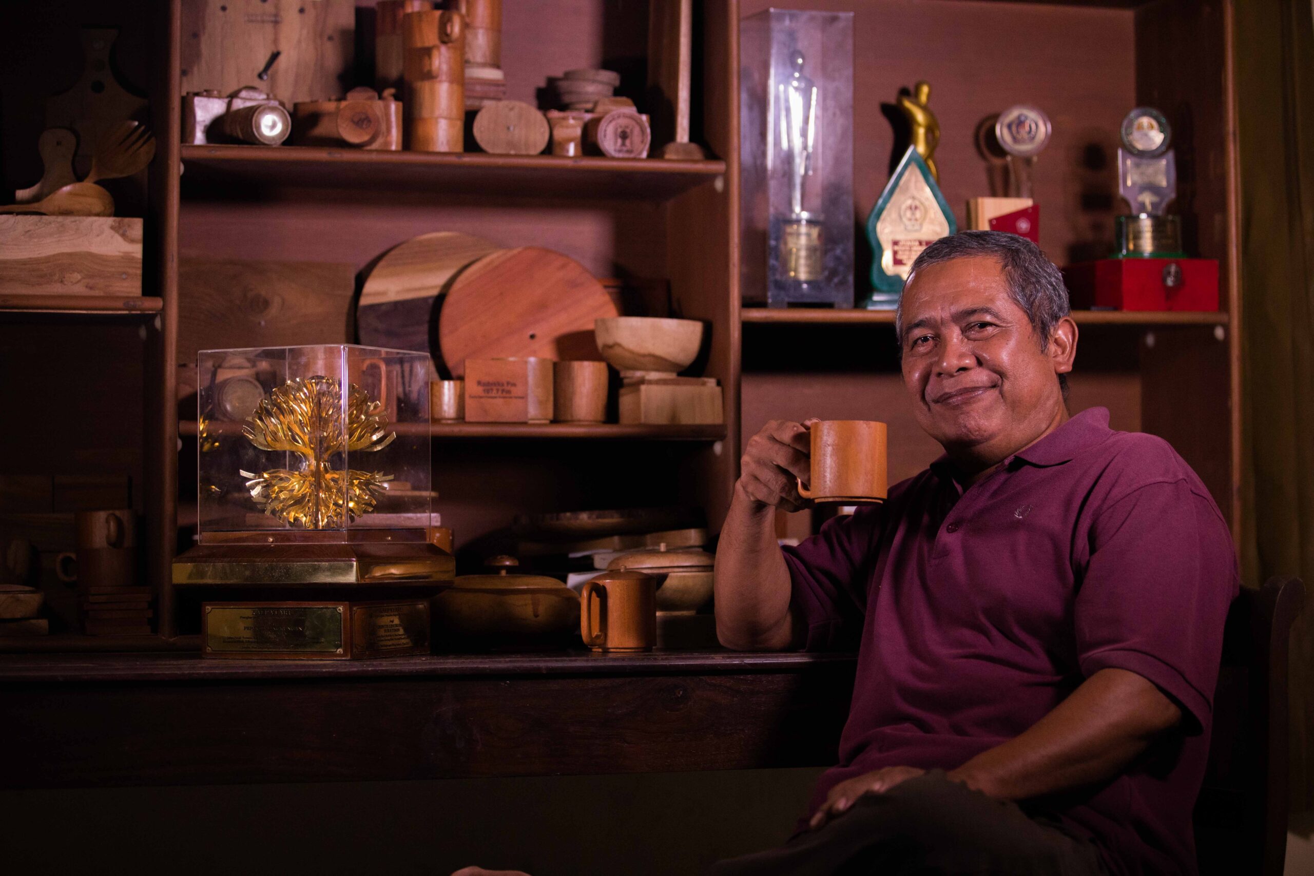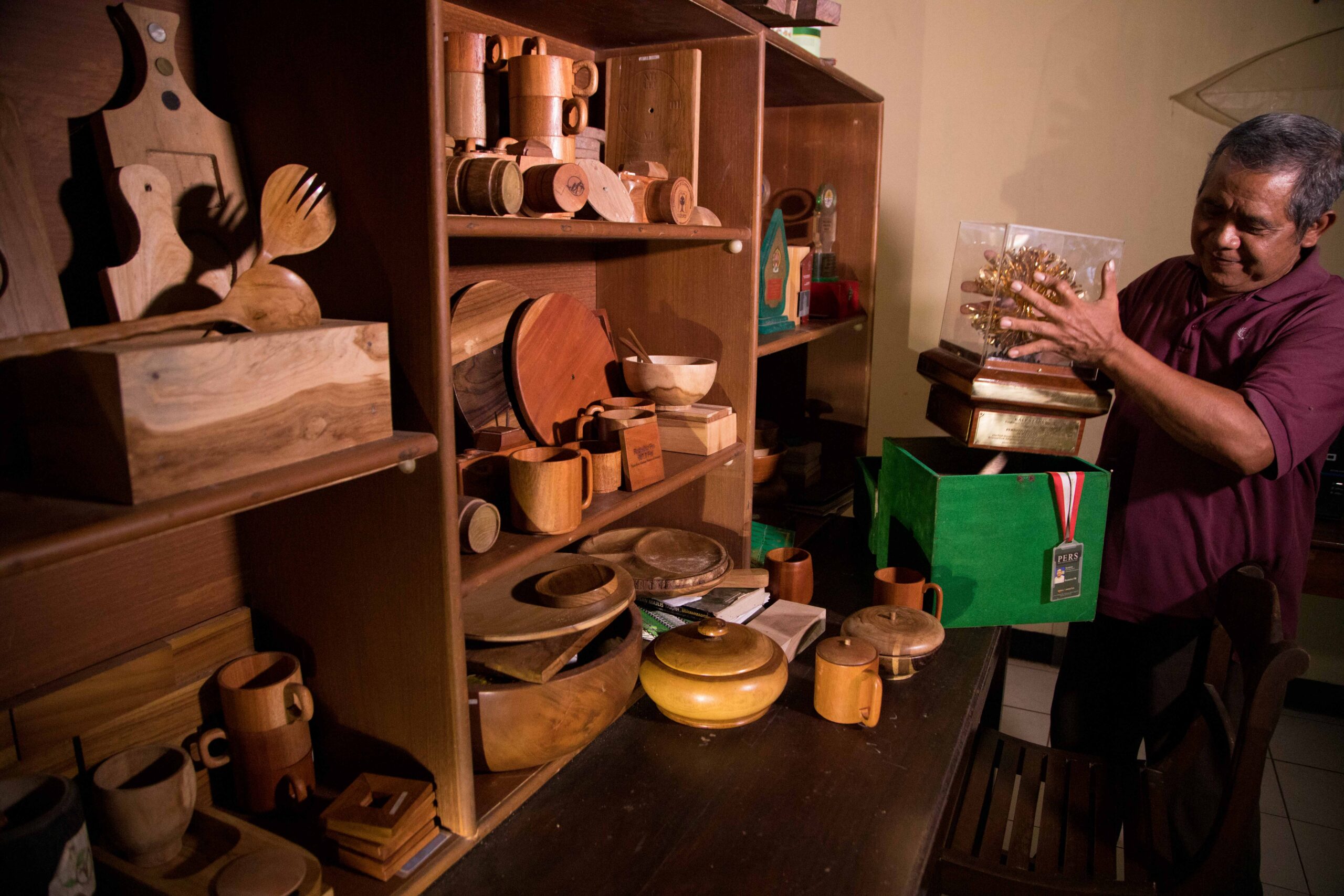 Suratimin (62) membuka sebuah kotak beludru berwarna hijau. Perlahan dia keluarkan isinya. Ada kotak kaca dengan benda berwarna kuning emas yang ikonik karya Markus Djajadiningrat.