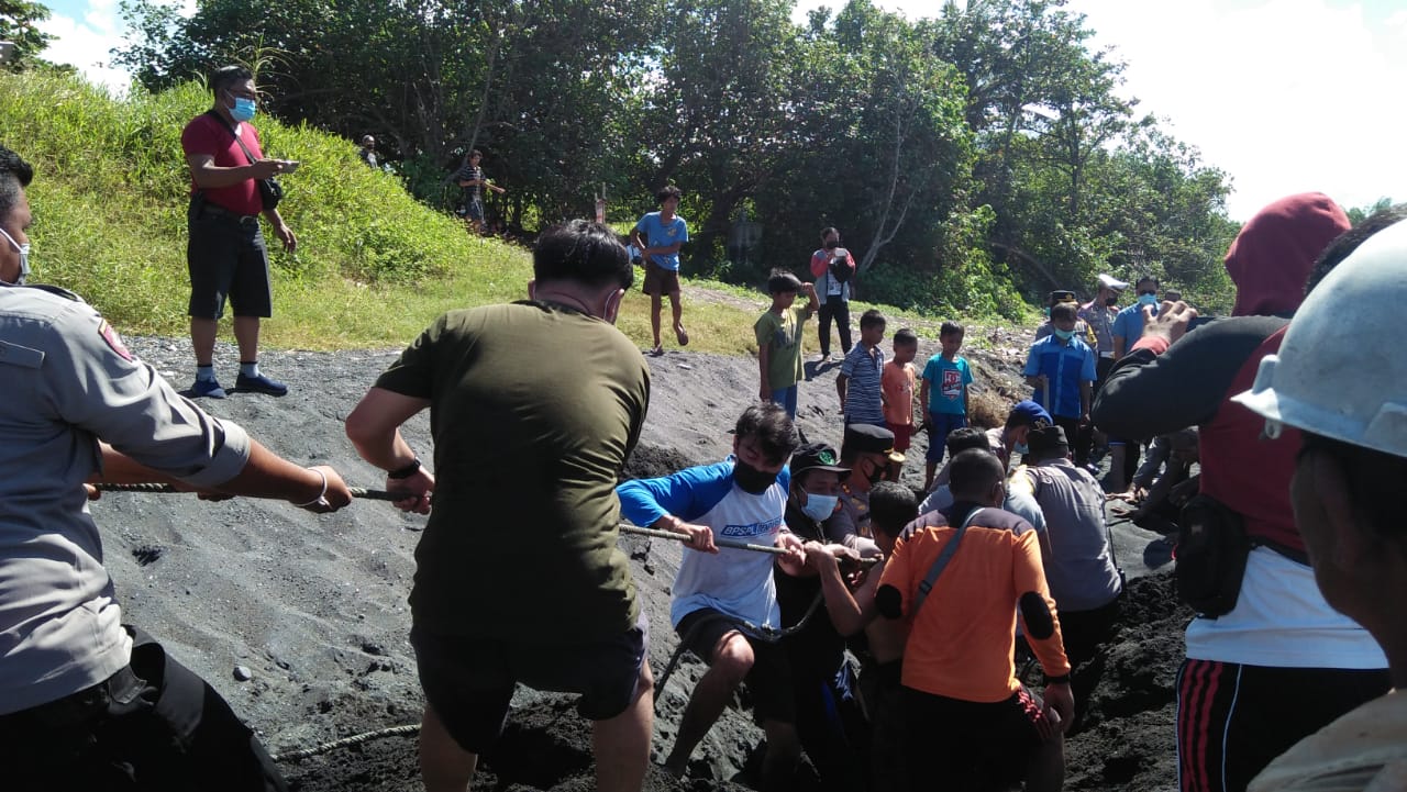 Hiu paus dengan panjang 7,5 meter ini hanya diam terombang-ambing seakan tak bertenaga. Namun sejumlah warga termasuk dua warga asing terlihat terus berupaya mendorong agar mendapatkan air lebih dalam. Warga terus berdatangan, pantai makin padat. Anak-anak juga terlihat ikut mendorong hiu paus (Rhincodon typus) dengan lingkar tubuh sekitar 2 meter ini ke tengah laut.