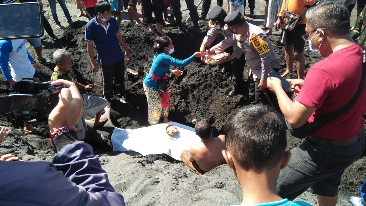 Setelah dilakukan identifikasi secara visual disimpulkan jenis Rhincodon typus (Hiu Paus). Tim penanganan memutuskan tidak melakukan otopsi karena bagian tubuh yang penting hilang. Hiu paus selanjutnya dikubur di pantai dengan kedalaman sekitar 1,5 meter. Nampak banyak warga membantu proses penarikan dan menguburnya. Seperti biasanya, warga nampak memberikan sesajen di atas tubuhnya untuk menghormati satwa laut ini sebelum dikuburkan.