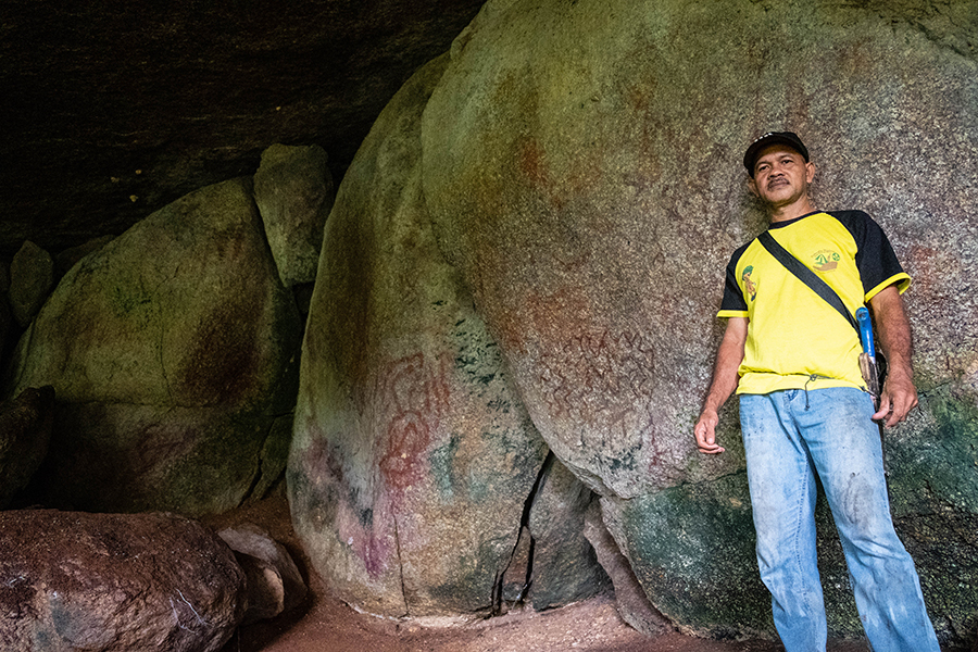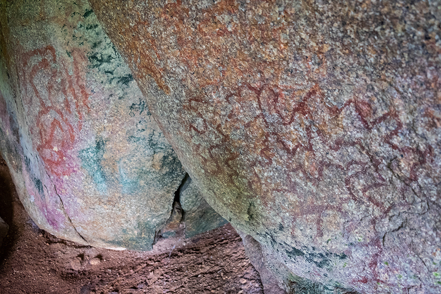 Di antara tumpukan batu yang menyanggah lempengan batu besar tersebut terdapat ceruk menyerupai gua. Pada empat permukaan batu granik, terdapat lima lukisan atau gambar manusia purba [Austronesia].