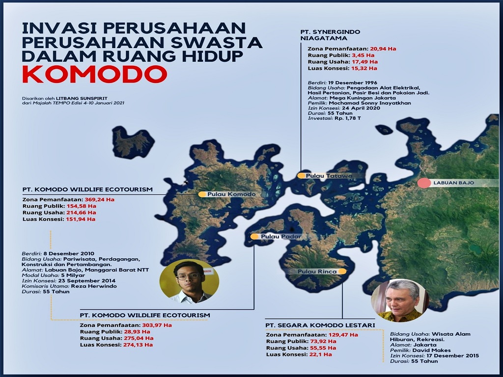 Sejauh ini, pemerintah tengah memberi izin konsesi kepada tiga perusahaan yaitu PT Sagara Komodo Lestari di Pulau Rinca seluas 22,1 Ha, PT Komodo Wildlife Ecotourism di Pulau Padar seluas 274,13 Ha dan Pulau Komodo seluas 151,94 Ha.