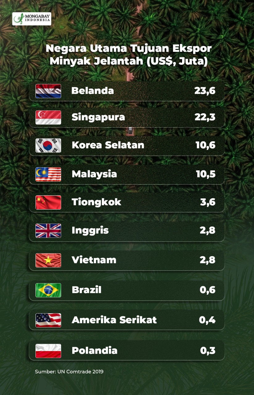 Selama ini, Indonesia memang telah mengekspor minyak jelantah yang merupakan bahan baku biodiesel ke berbagai negara, utamanya ke Eropa, Amerika Serikat (AS), Singapura, Korea Selatan, Tiongkok, bahkan ke negara-negara di Asia Tenggara seperti Malaysia dan Vietnam. Di sisi lain, nilai ekspor minyak jelantah pun terus mengalami peningkatan sejak 2014 lalu.