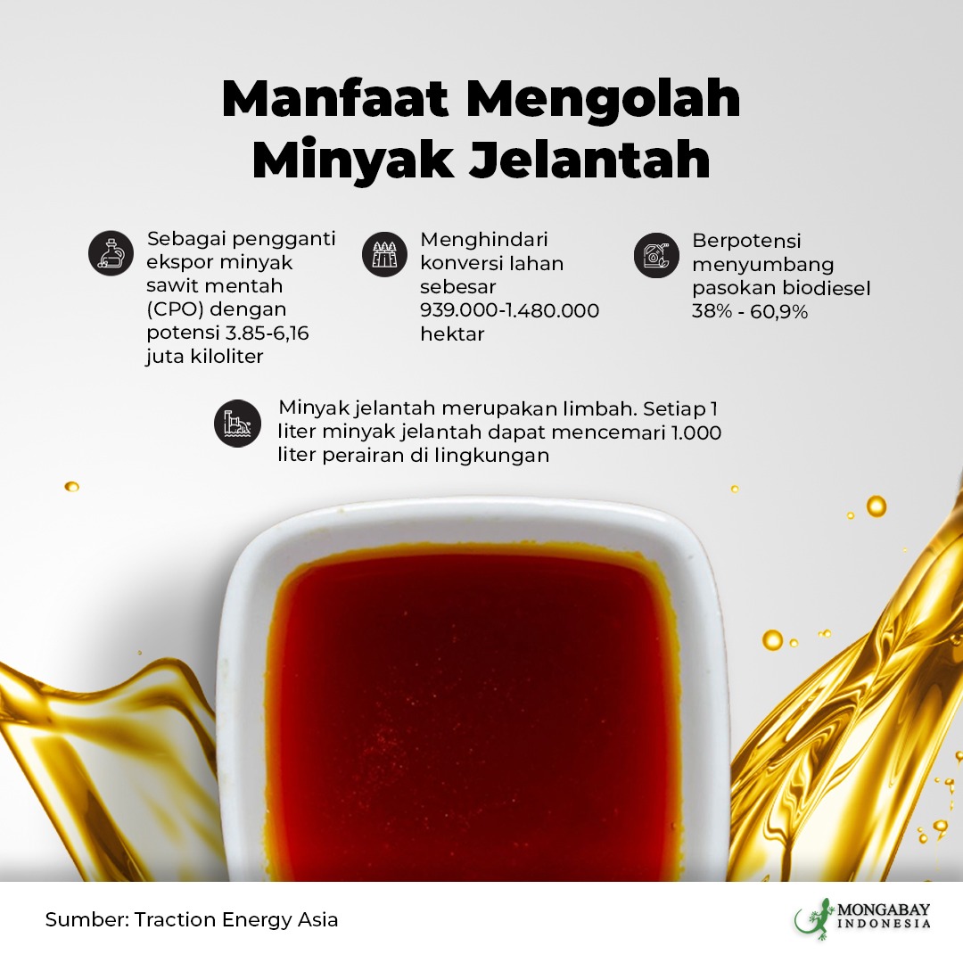 - Beberapa pihak lebih memilih menjual minyak jelantah ke Eropa karena harganya lebih tinggi ketimbang mengolahnya sendiri di tanah air dan karena pasar minyak jelantah di Indonesia untuk penggunaan biodiesel masih belum sebanyak di luar negeri. Padahal penggunaan bahan bakal alternatif dari minyak jelantah berpotensi mengurangi alih fungsi lahan untuk industri sawit, mengurangi emisi CO2 dan berbagai keuntungan lainnya.