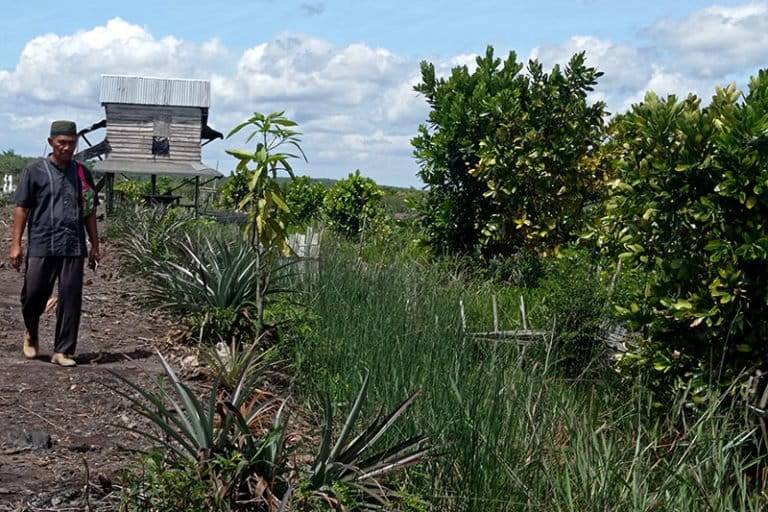 Lahan gambut yang dikelola Haji Nungcik itu pernah terbakar pada 1997. Tahun 2015, lahan seluas tiga hektar tersebut kembali terbakar, meski telah dikelola dengan menanam padi sonor atau padi semai.