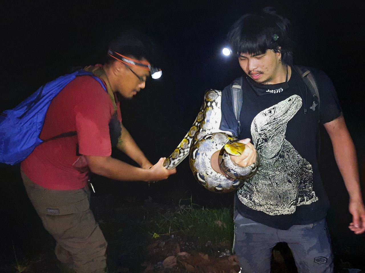 Nathan dan Adi, dua orang berpangalaman menangani ular dengan tenang menunjukkan bagian satwa ini seperti kulit dan kepalanya. Hal menarik, piton jantan setidaknya memiliki 2 alat kelamin untuk menyesuaikan diri saat posisi kawin.