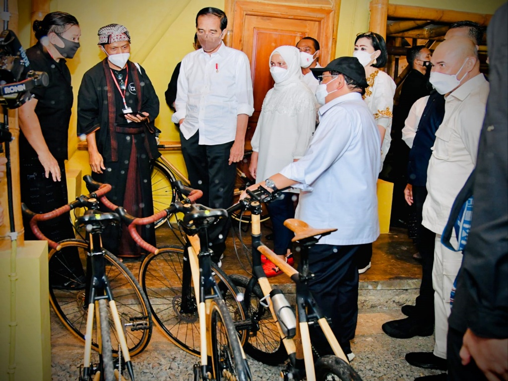 Presiden Jokowi dan PM Albanese menggunakan sepeda bambu yang dirancang untuk digunakan di jalan raya karya Singgih S. Kartono dari Kabupaten Temanggung, Provinsi Jawa Tengah.