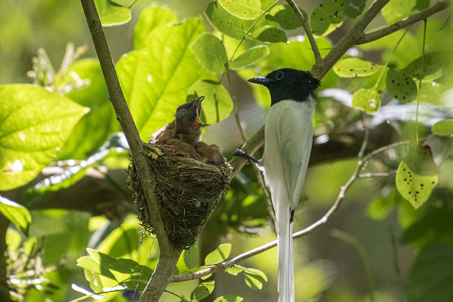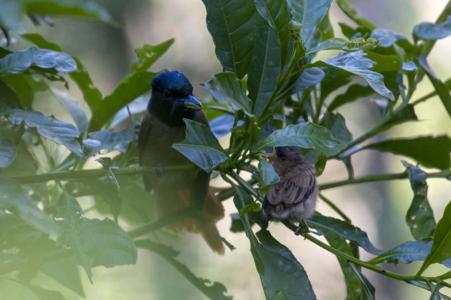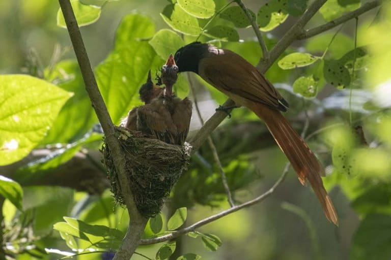Saat mengeram selesai, kekompakan jantan dan betina semakin terlihat. Anakan yang baru netas, diberi makan oleh keduanya sepanjang hari. Mereka bergantian mencari makan untuk sang anak, namun tetap waspada dengan keadaan di luar sarang.