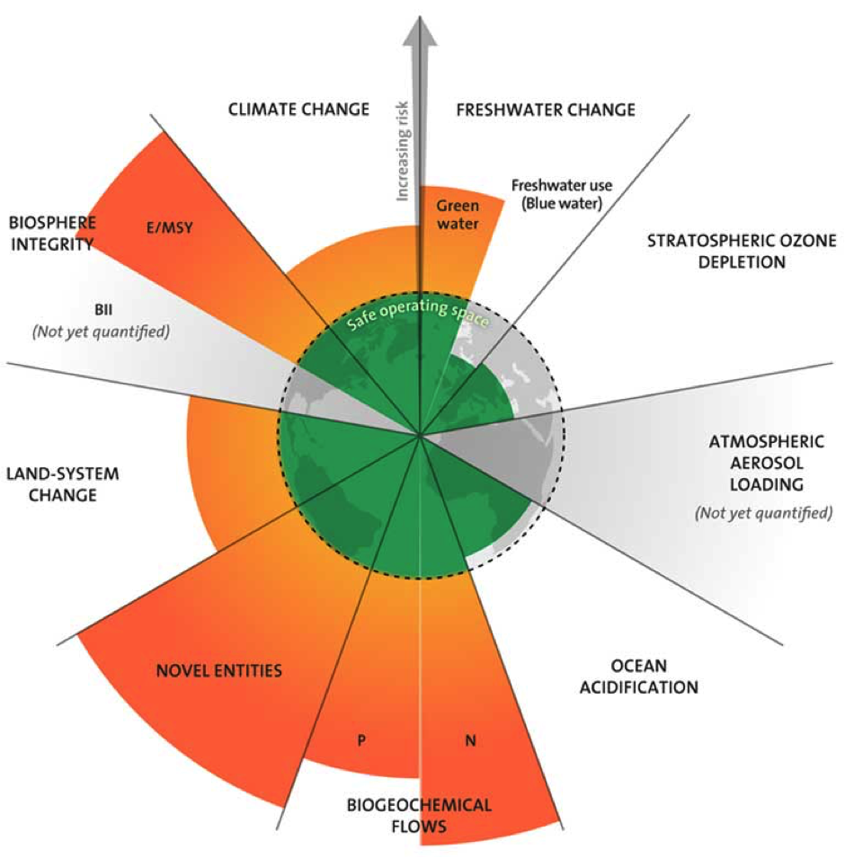 Penelitian yang diterbitkan pada tahun 2015 menunjukkan bahwa kita telah melampaui empat batasan: perubahan iklim, integritas biosfer, perubahan sistem lahan, dan siklus biogeokimia fosfor dan nitrogen yang berubah. Baru-baru ini, para ilmuwan telah mengindikasikan bahwa kita juga telah memasuki zona bahaya untuk dua batas planet lainnya: pelepasan entitas baru, termasuk polusi plastik, dan destabilisasi air tawar.
