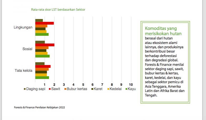Temuan Forests & Finance juga menunjukkan, para penyandang dana terbesar sektor bubur kertas dan kertas di Indonesia dan daging sapi di Brasil memiliki kebijakan sangat lemah dan hanya memberikan beberapa perlindungan untuk mencegah degradasi lingkungan yang memicu kebakaran hutan dan lahan.
