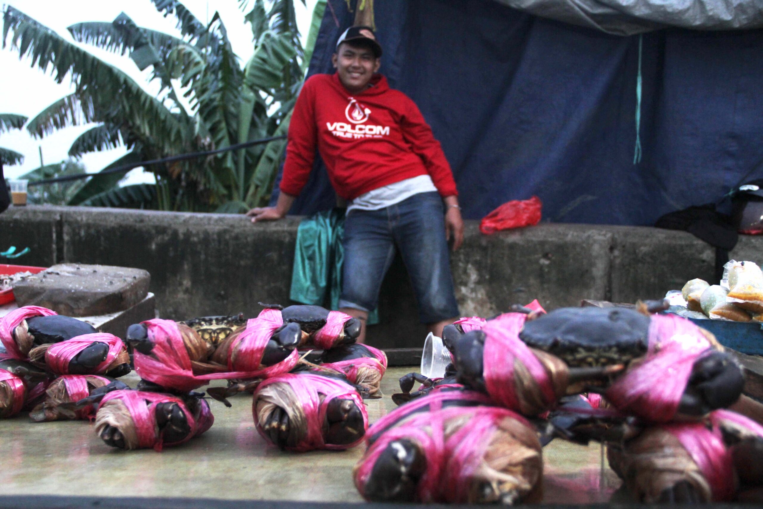 Abdullah, 40 tahun mengaku, kepiting yang dijual tersebut merupakan jenis kepiting bakau. Ia membelinya bukan langsung dari nelayan, melainkan dari pedagang lain yang kemudian dijual kembali.