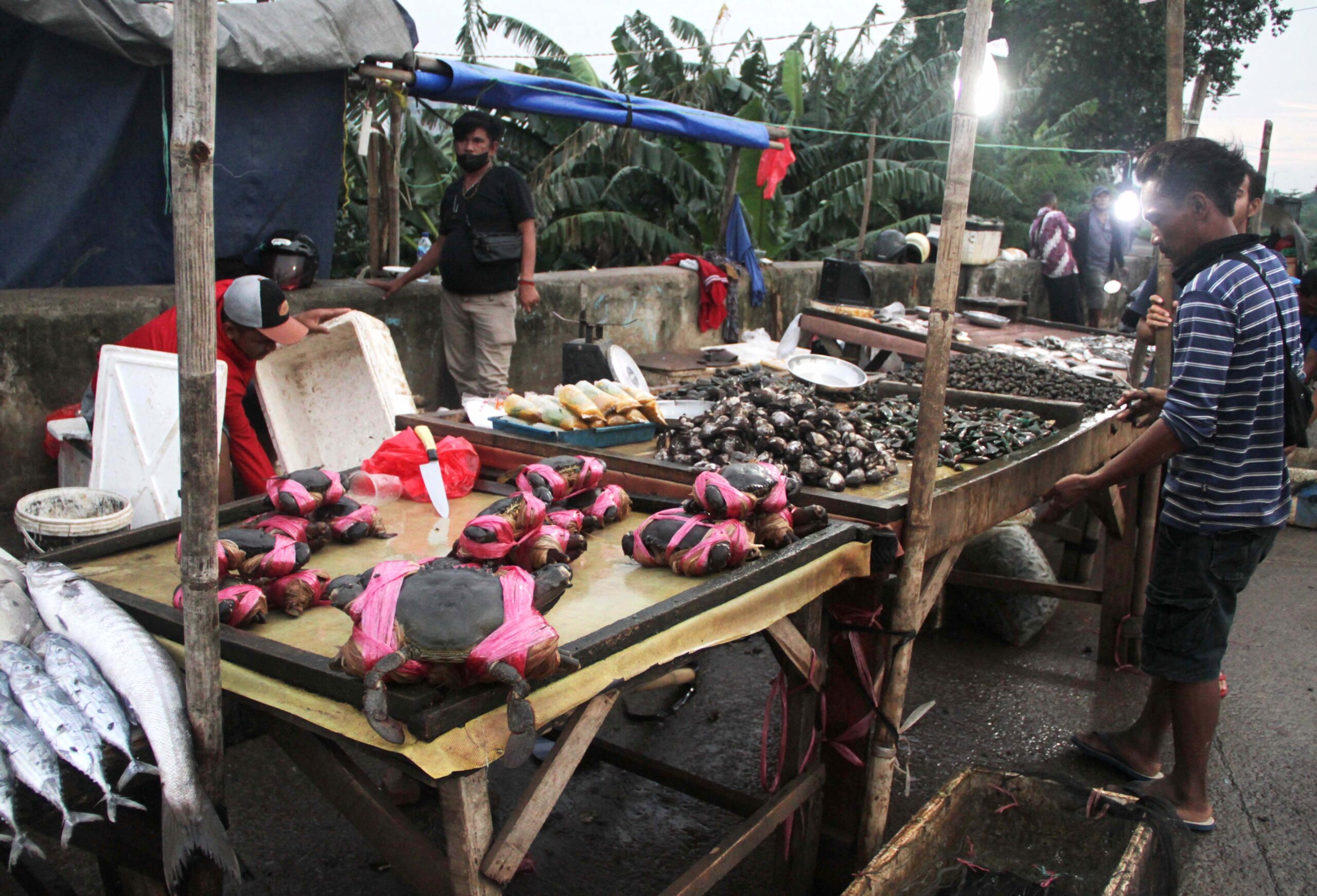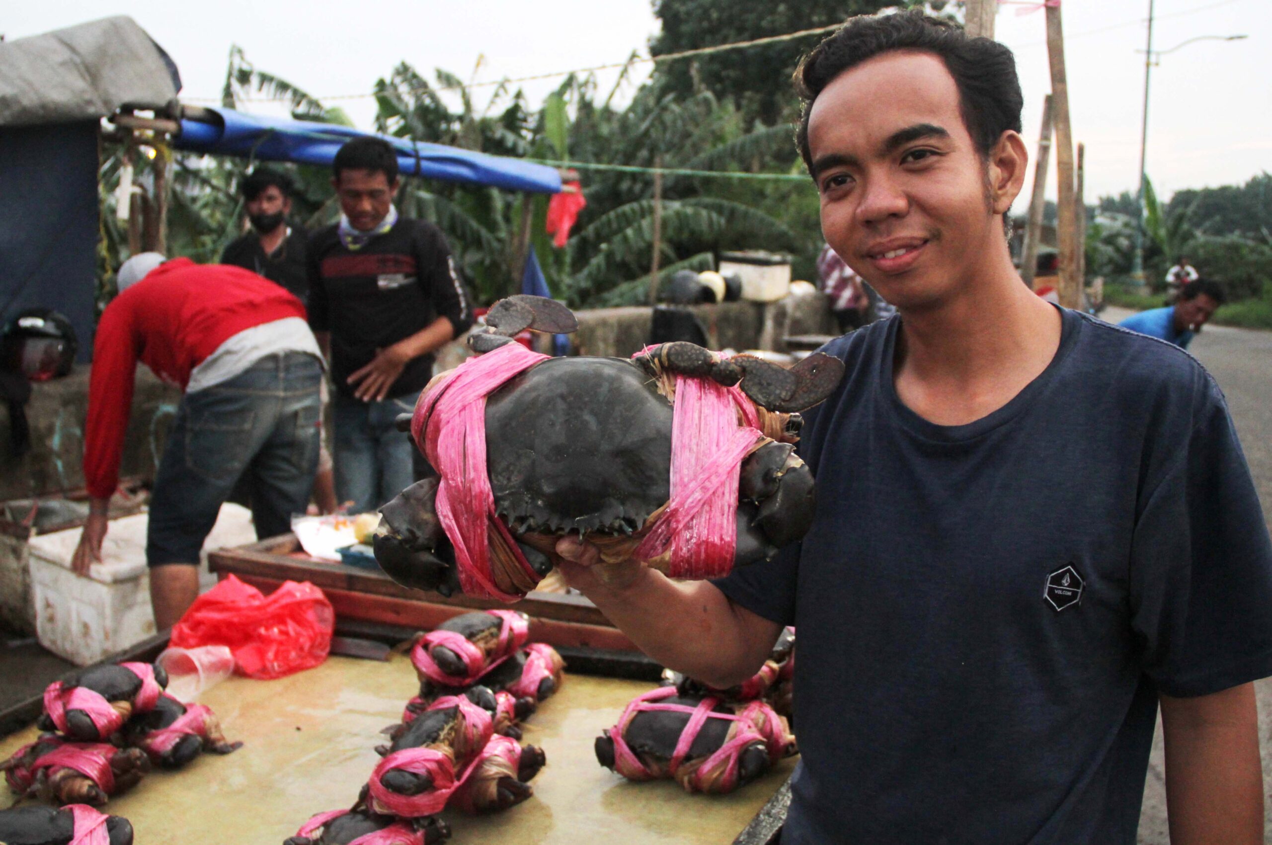 Diantara lalu lalang kendaraan yang melintas di jalan raya Banjir Kanal Timur (BKT), Kelurahan Rorotan, Kecamatan Cilincing, Jakarta Utara, DKI Jakarta, sejumlah pedagang terlihat menunggu para pembeli. Selain buah-buahan yang dijual, sebagian besar dari pedagang itu nampak menawarkan aneka ragam hasil laut, termasuk kepiting bakau (Scylla spp.).