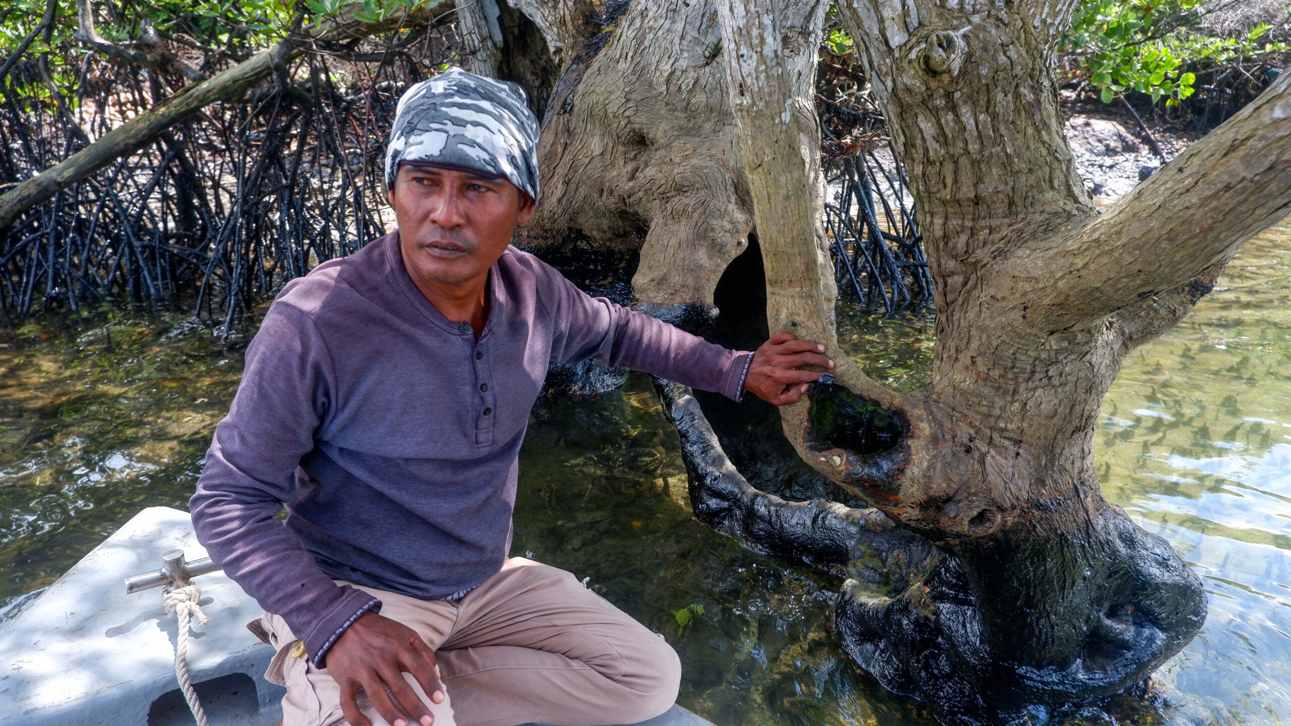 “Habis semuanya, mana ada lagi ikan di laut, telur-telur udang akan mati, siapa yang mau disalahkan terhadap kerusakan ini,” ujar Mohammad Sapet (57 tahun) nelayan Pulau Buluh saat menunjukan kondisi tumpahan minyak hitam yang mencemari laut pesisir Tanjung Uncang, Kota Batam, Kamis siang, 1 Desember 2022.