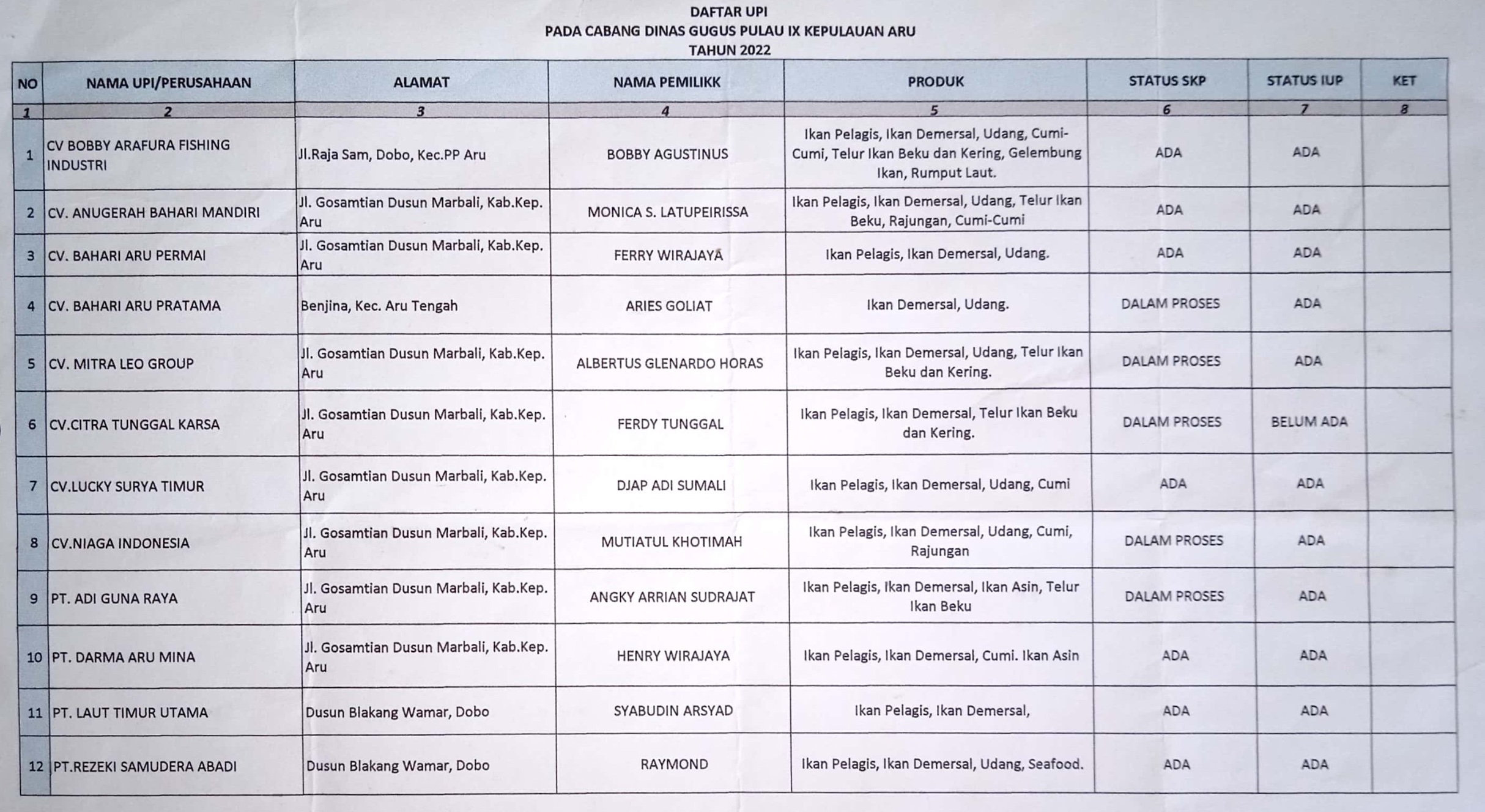 Masing-masing adalah CV Bahari Aru Utama, CV Mitra Leo Group, CV Niaga Indonesia, PT Adiguna Raya, dan CV Tunggal Karsa. Sedang 1 UPI, yaitu CV Citra Tunggal Karsa tidak memiliki Izin Usaha Perikanan (IUP).