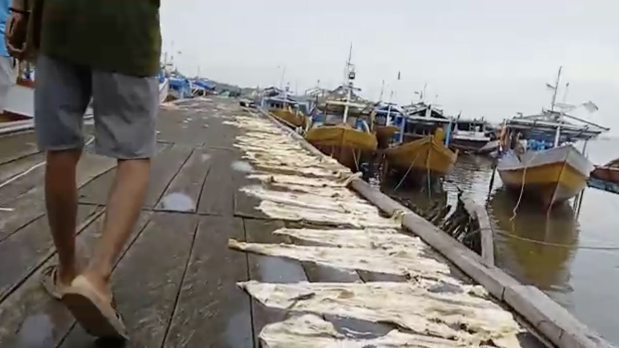 Sepanjang pelabuhan kayu Pantai Belakang Wamar, Kota Dobo, Kabupaten Kepulauan Aru, Maluku (11/02/2023), berlabuh belasan kapal nelayan berukuran 10-15 gross tonnage (GT). Di sepanjang pelabuhan berjejer kulit hiu. Area pelabuhan hanya menyisakan sekira dua meter untuk lalu-lalang orang.