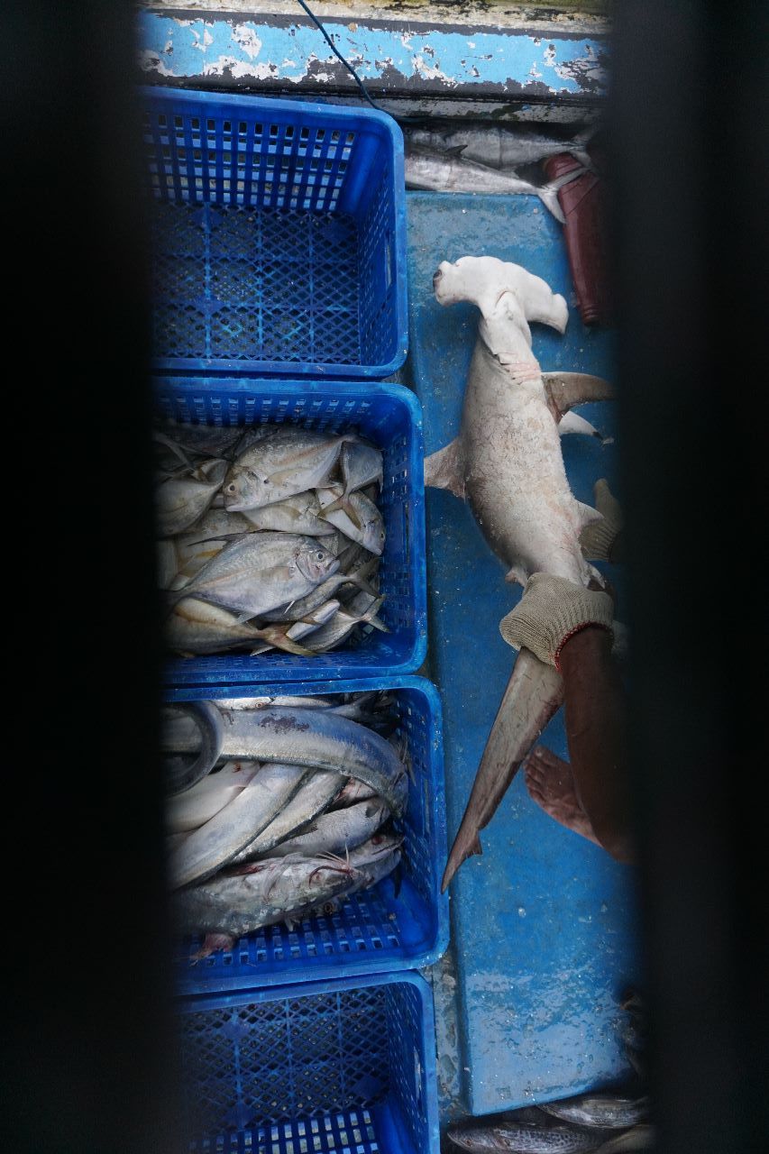 Sedang di sisi kiri ujung pelabuhan, terparkir kapal berkelir biru membongkar hasil tangkapan. Dari palka, awak kapal mengangkat potongan daging hiu pari untuk dipindahkan ke gerobak besi.