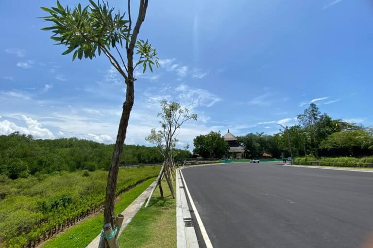Mulai dari pintu masuk, ada semacam monumen G20 di pinggir jalan raya utama Bypass Ngurah Rai. Kemudian, ada parkir kepala negara mencapai 2,6 hektar dengan kapasitas hampir 500 kendaraan. Parkir sangat luas ini juga ditutup dan lengang. Sebelumnya, ada lokasi pembibitan atau persemaian permanen sejumlah jenis pohon di area ini, yang harus dipindah ke area lain di sekitar mangrove.