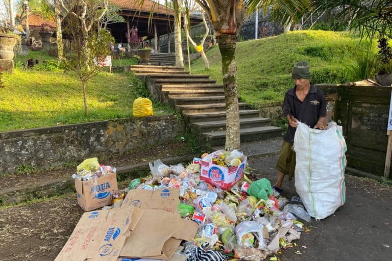 Selain itu, sampah kemasan makanan sekali pakai seperti gelas plastik, kemasan mie gelas instan, dan minuman terlihat menumpuk di halaman depan pura, terutama di lokasi peristirahatan, seperti kebun dan wantilan.