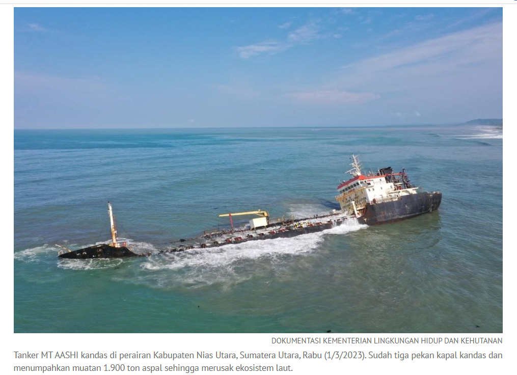 Ada juga kapal tanker MT AASHI yang mengalami insiden kebocoran lambung kapal hingga mengalami karam pada 10 Februari 2023 di pantai barat Pulau Nias, Sumatera Utara. Berdasarkan data International Maritime Organization (IMO) kapal ini dimiliki oleh AASHI SHIPPING INC yang beralamat di Liberia.