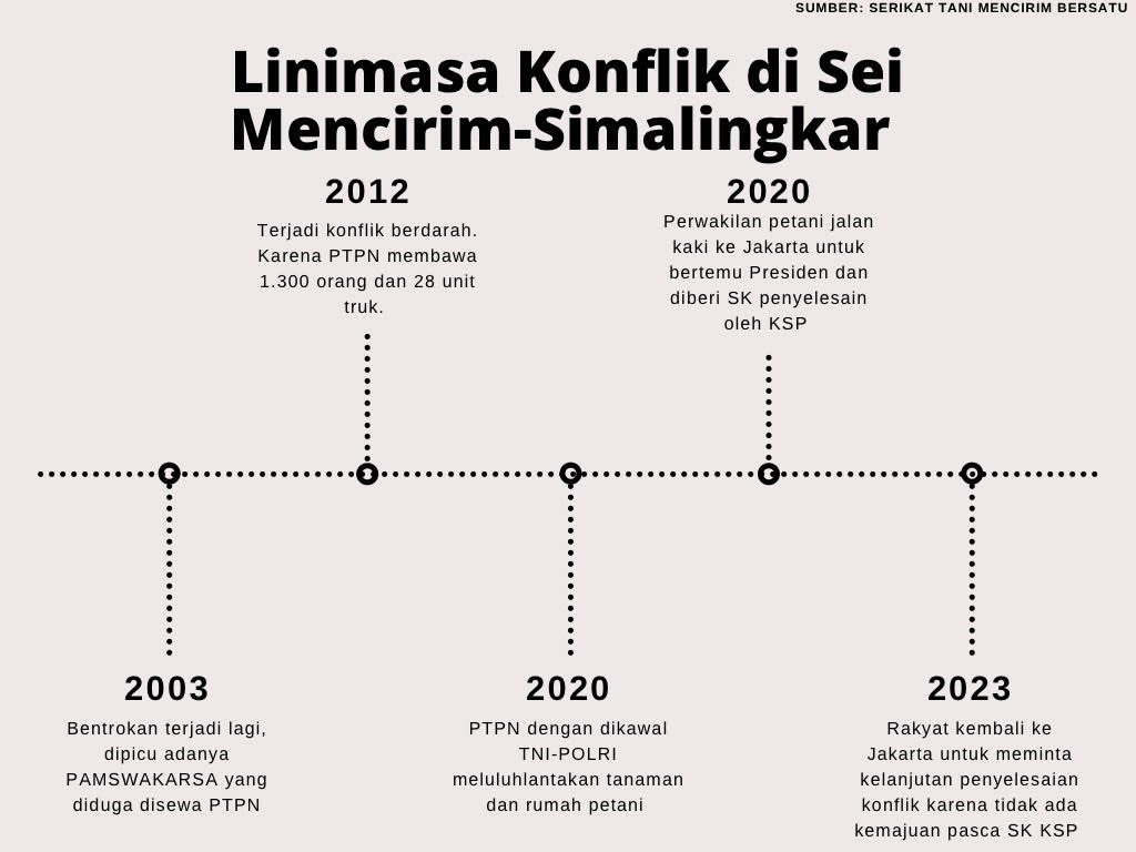 - Juni lalu, perwakilan Serikat Tani Sei Mencirim Bersatu (STMB) dan Serikat Petani Simalingkat Bersatu (SPSB) kembali ke Jakarta menagih janji penyelesaian konflik pada pemerintah.