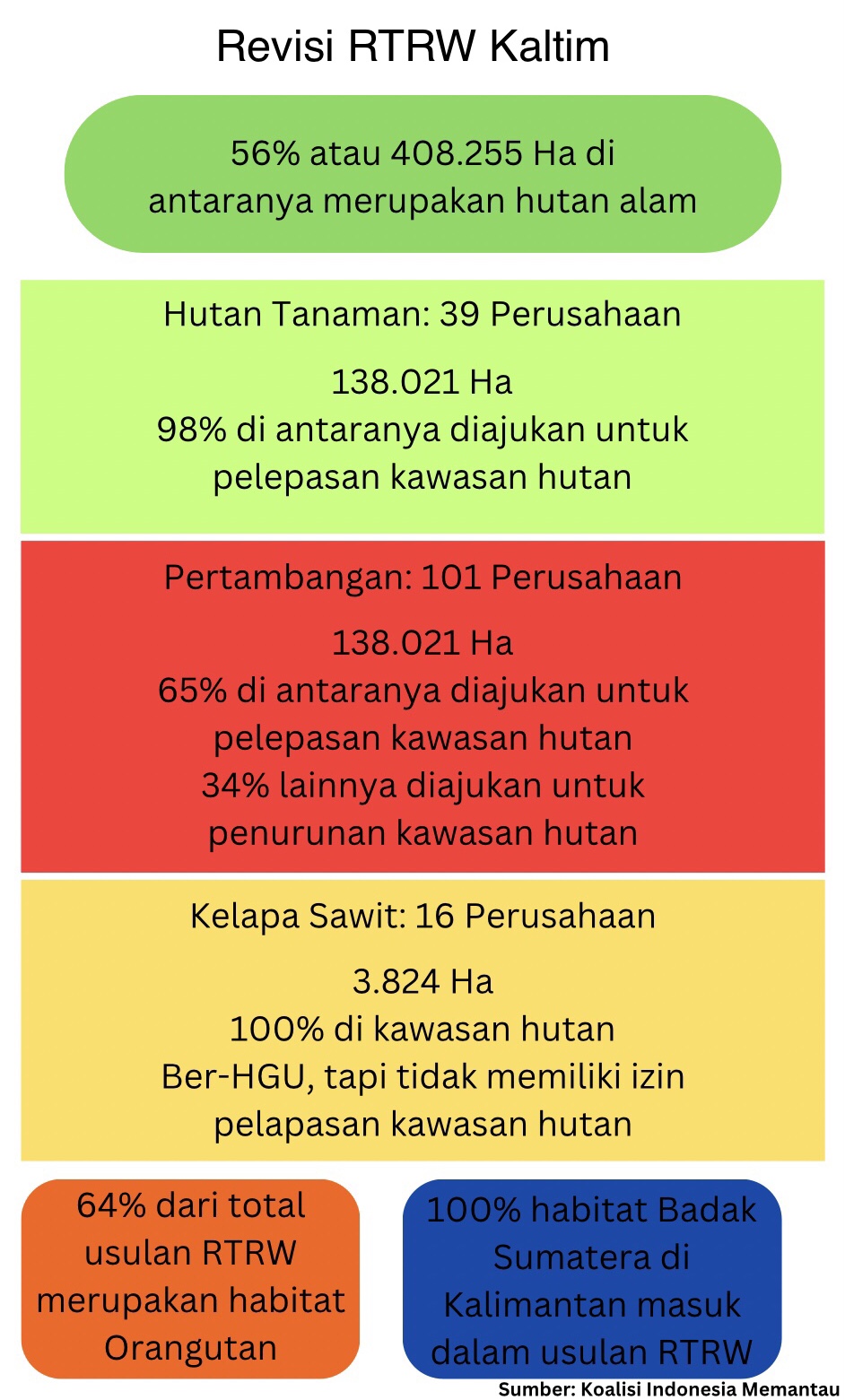 - Koalisi yang terdiri dari Walhi, Yayasan Auriga Nusantara, Konsorsium Pembaruan Agraria (KPA), Forest Watch Indonesia (FWI), Walhi Kalimantan Timur dan AMAN Kalimantan Timur ini mencatat, ada upaya pelepasan kawasan hutan hingga 612.355 hektar dalam RTRWP Kaltim. Seluas 101.788 hektar lainnya merupakan penurunan kawasan hutan. Total 736.000 hektar atau 97% kawasan dalam revisi RTRW akan berdampak pada kawasan hutan.