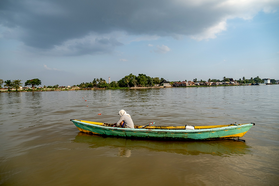 Suhu udara 34 derajat Celcius. Awal Agustus 2023. Tidak ada awan hitam menutupi matahari sore itu. Di atas sebuah sampan, Rusni [60] mengayunkan tangkul ke Sungai Pampangan, di belakang rumah panggung kayu miliknya.