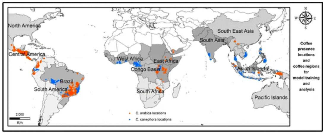 Krisis iklim telah membuat landscape pertanian kopi berubah. Sebuah studi menggunakan algoritma machine learning memprediksi wilayah di planet bumi yang cocok untuk ditanami kopi menyempit sekitar 50 persen gara-gara krisis iklim. Produktivitas baik robusta maupun arabika akan turun, dan penanaman kopi akan bermigrasi ke wilayah yang lebih tinggi yang berpotensi mengancam ekosistem.
