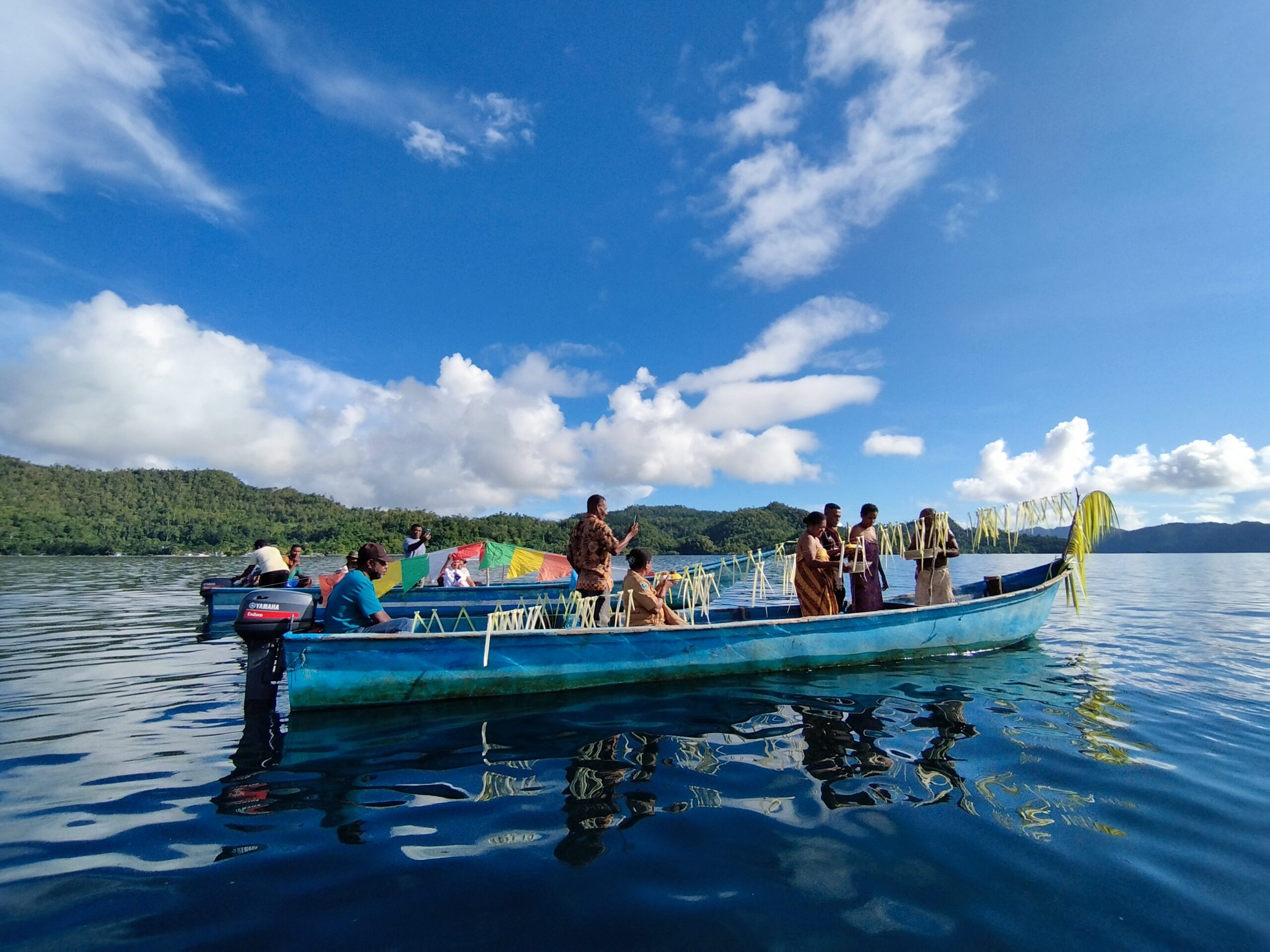 Selanjutnya, rombongan bergerak menuju dermaga pantai, tempat perahu-perahu cepat bersandar. Ketua adat naik ke salah satu perahu yang dihiasi dengan ornamen khas di sekelilingnya.