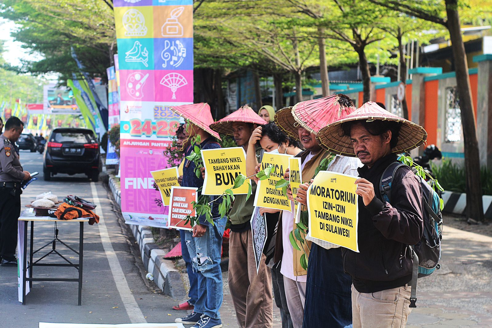 Puluhan warga dan aktivis Wahana Lingkungan Hidup Indonesia (WALHI) Sulawesi Selatan menggelar aksi unjuk rasa di depan kantor PT. Vale Indonesia Tbk. di Jalan Somba Opu Kota Makassar, menolak aktivitas perusahaan di kawasan Loeha Raya, Kecamatan Towuti, Luwu Timur, Sulawesi Selatan, Kamis (25/7/2024).