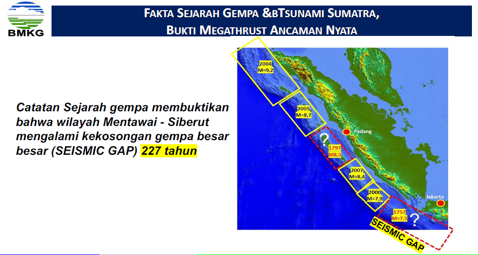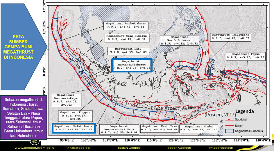 Zona megathrust di barat Sumatra- Selatan Jawa-Bali-Nusa Tenggara, dikenal dengan sebutan busur Sunda. Berdasarkan referensi dan catatan Badan Geologi pada 1903 terjadi gempa di selatan Jawa berkekuatan magnitudo 7,9; pada 1921 sebesar 7,3; pada 1937 sebesar 7,2; pada 1998 sebesar 7,8; pada 2007 sebesar 7,7. “Setelah 1900-an, belum pernah terjadi gempa yang berkekuatan magnitudo 8,” katanya.