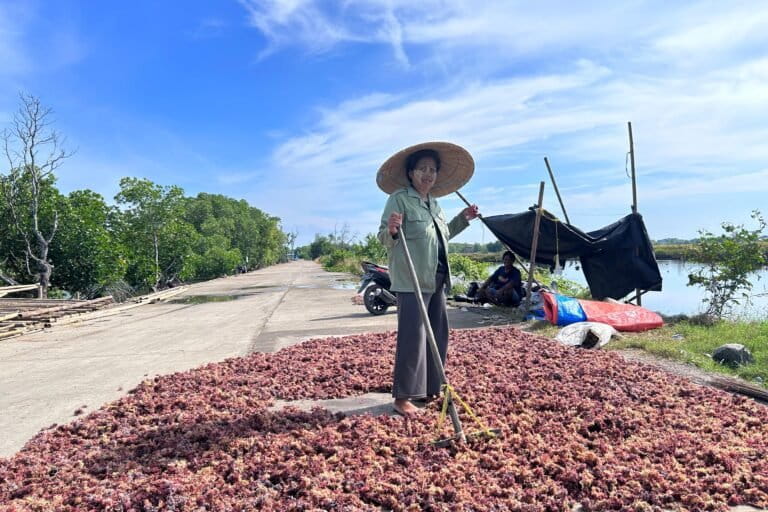 Rahmatiah sibuk mengeringkan rumput laut yang telah dipanen. Dengan topi anyaman daun kelapa dan setelan daster, dia mulai menata hasil lautnya agar siap untuk dijual ke pengepul. Dia berharap harga jualnya tidak jatuh di tengah ketidakpastian hasil panen karena cuaca ekstrem.