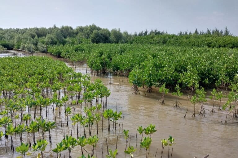 Nurchayati berjalan di antara rerimbunan mangrove siang itu, sembari mengenang masa-masa sulit. Mentari begitu terik, tetapi pepohonan mangrove melindungi mereka yang berada di bawahnya. Angin berembus menerpa dedaunan.