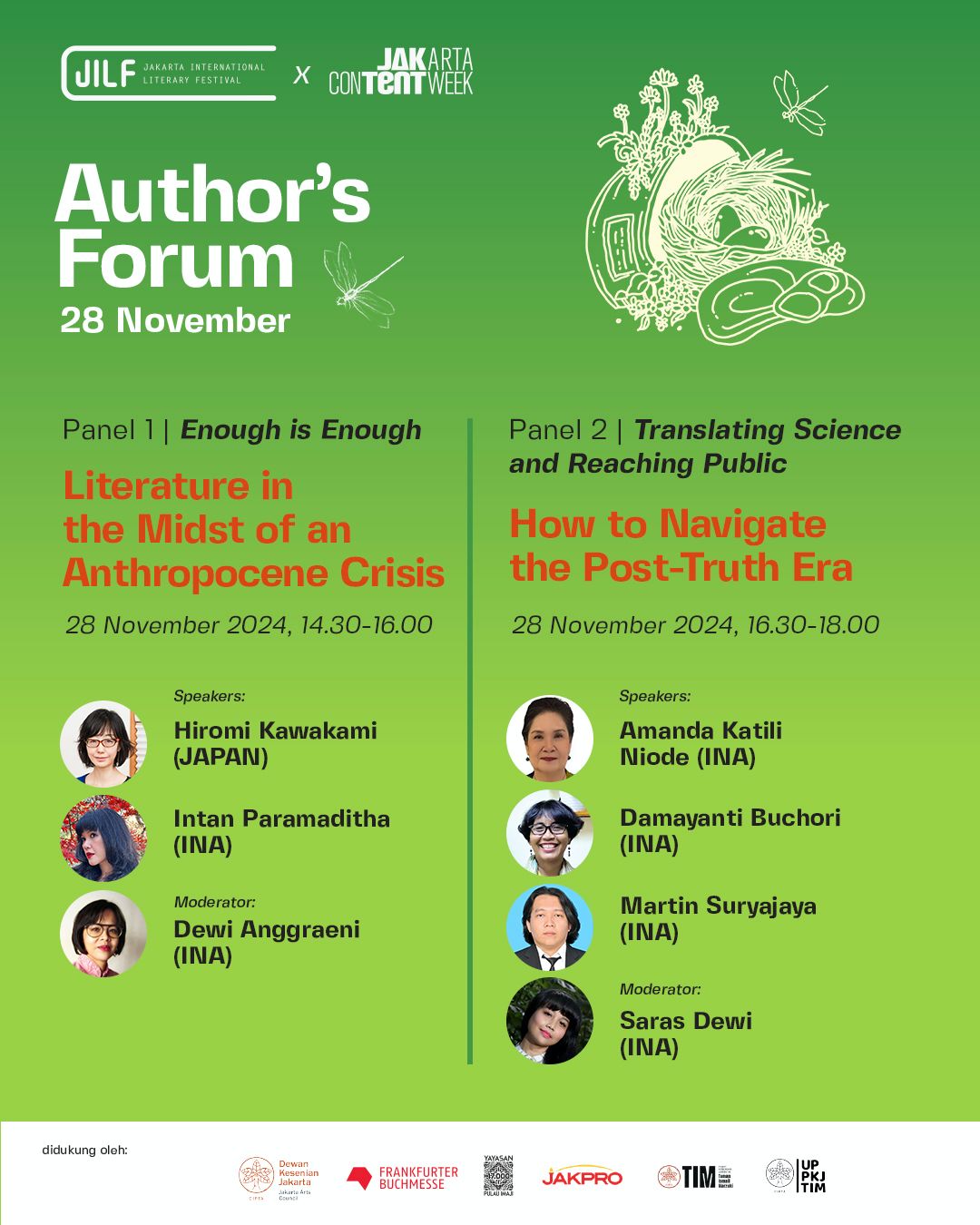 - Anton Kurnia, Direktur JILF dan Ketua Komite Sastra Dewan Kesenian Jakarta mengatakan, fakta kerusakan lingkungan hidup terjadi karena berbagai hal, seperti industri ekstraktif. Dampaknya pun terasa di berbagai penjuru dunia, seperti global warming dan global boiling.