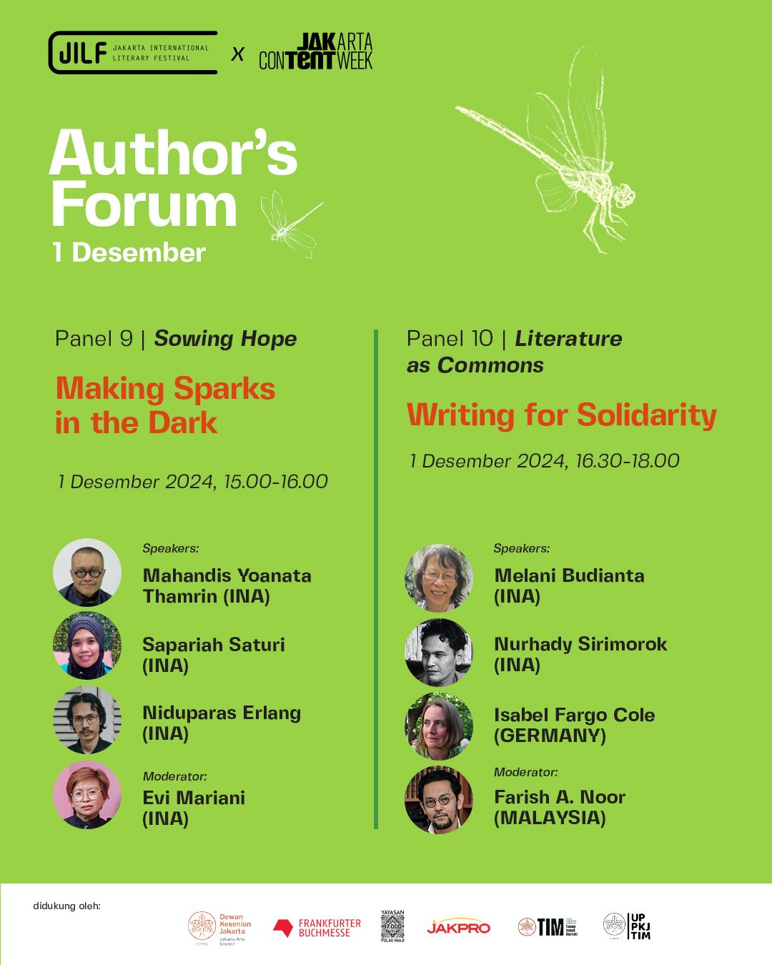 - JILF x JakTent 2024 di Taman Ismail Marzuki ini berkolaborasi dengan banyak pihak dan menampilkan diskusi serta pameran yang berkaitan dengan tema itu. Antara lain, ada pameran media bekerja sama dengan National Geographic Indonesia, Mongabay Indonesia, dan Trend Asia. Ada bazar buku, forum penulis dalam 1O panel utama, peluncuran buku dan diskusi terkait tema, malam anugerah Sayembara Kritik Sastra.