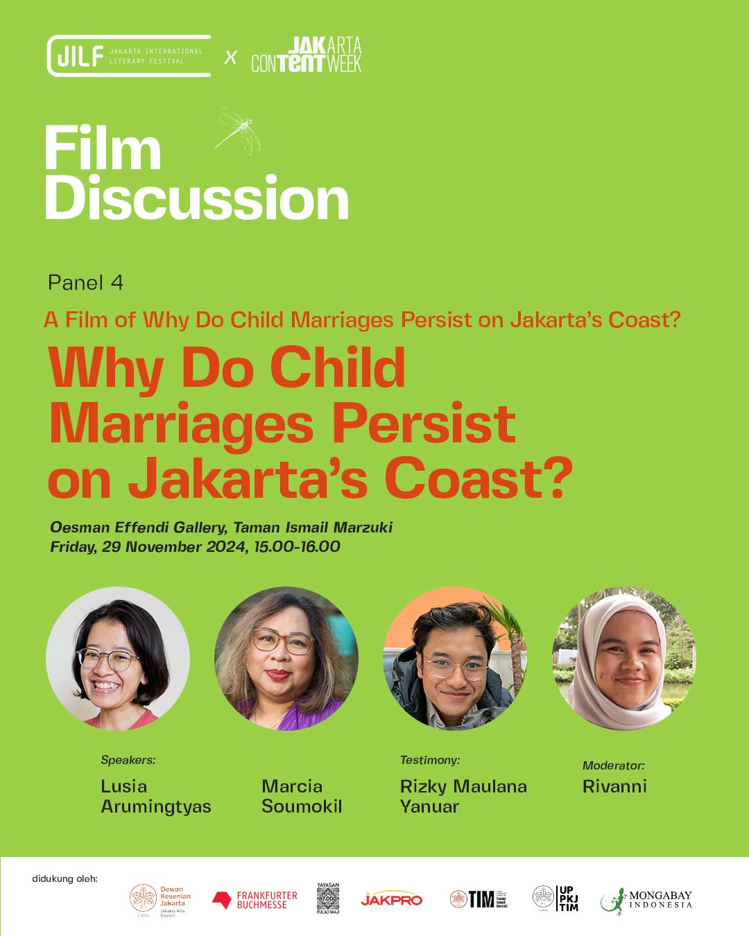 Pada 29 November 2024 pukul 15.00-16.00 WIB, Mongabay juga mengadakan pemutaran film dan diskusi bertema “Mengapa Pernikahan Anak Masih Terjadi di Pesisir Jakarta?” (“Why Do Child Marriages Persist on Jakarta’s Coast?”) di Galeri Oesman Effendi, Taman Ismail Marzuki .