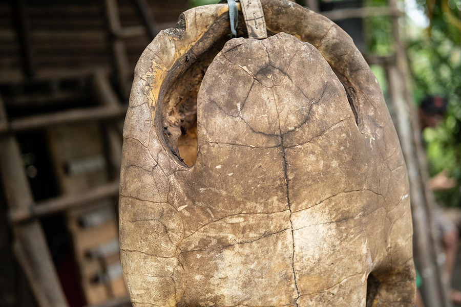 Sebuah kerapas atau tempurung kura-kura berukuran besar yang tergantung di pondok kebun warga, menarik perhatian kami. Panjangnya sekitar 60 sentimeter dengan diameter sekitar 30 sentimeter.