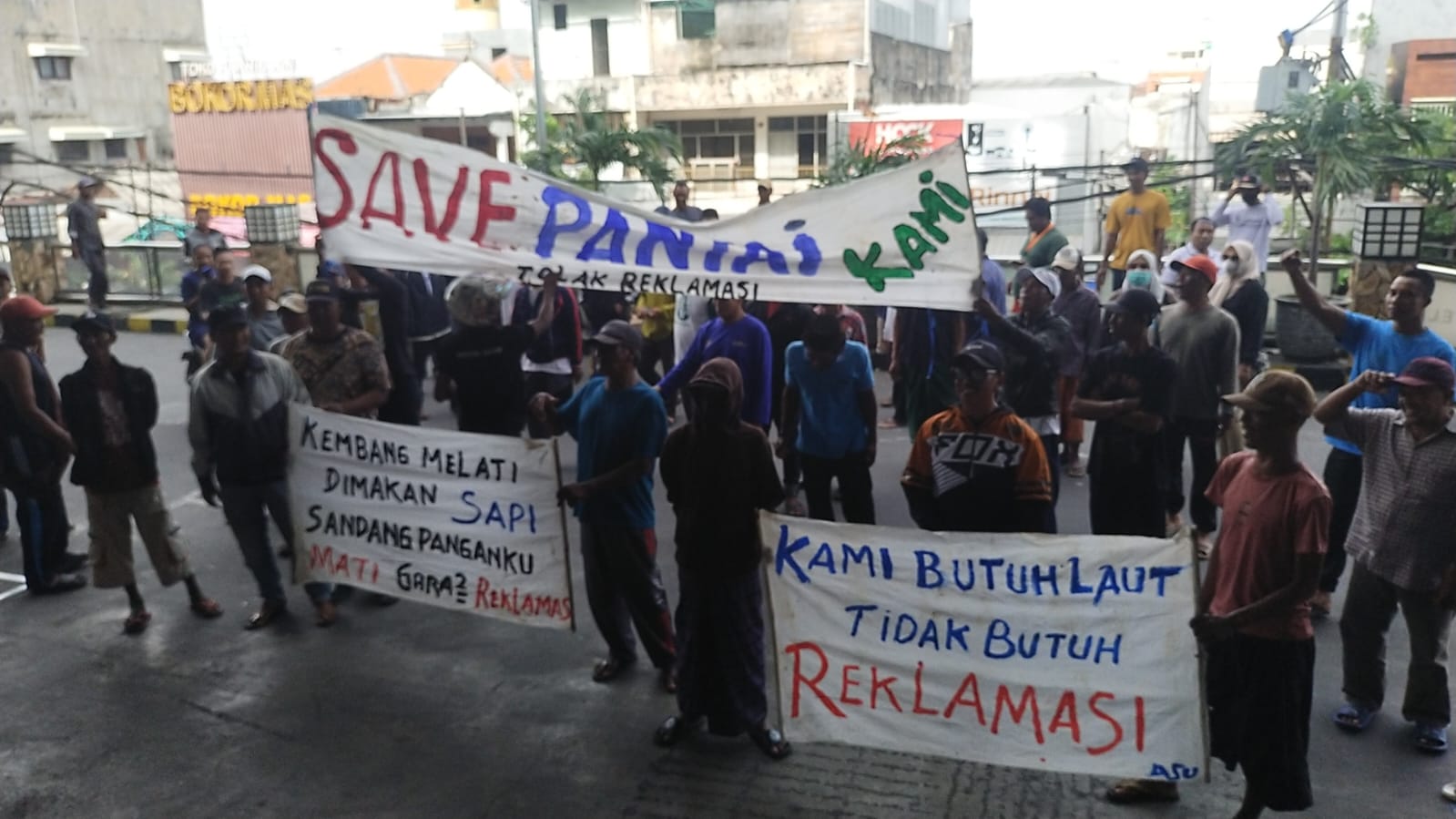 Dari kantor kelurahan, sekitar 200-an warga ini bergerak ke Palm Park Hotel, tempat sosialisasi. Disana, mereka membentangkan sejumlah spanduk. ”Save pantai kami.” “Kami butuh laut tidak butuh reklamasi.” “Lawan reklamasi” Begitu antara lain bunyi spanduk penolakan nelayan.