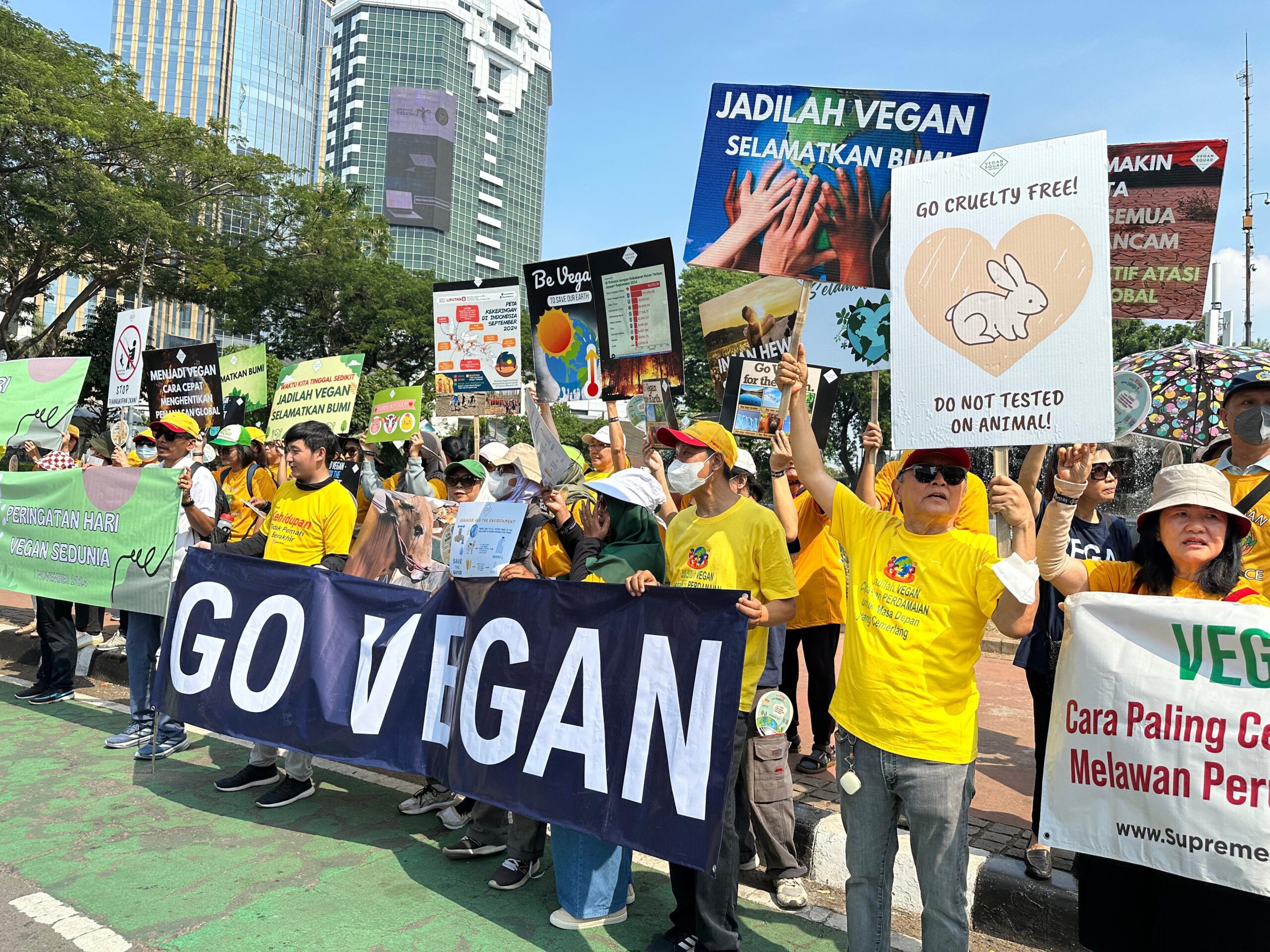 “Bumi kita adalah yang akan pertama kena dampak, kalau kita tidak ambil sikap segera. Jadi vegan, hentikan pembunuhan, demi menyelamatkan bumi.”