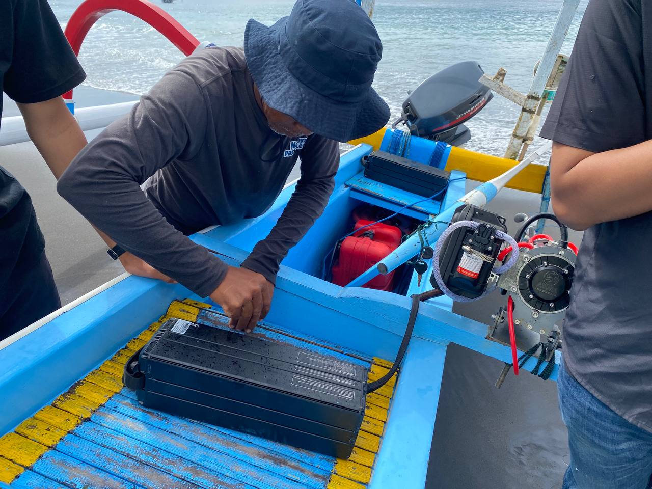 Fachry Ahmad dari Azura menunjukkan mesin yang terpasang di jukung. Bentuknya lebih kecil dibanding mesin tempel. Dekat mesin ada 3 baterai yang berpotensi mudah kena percikan air laut atau air hujan. Namun menurutnya mesin listrik ini dan baterainya mudah karatan karena sebagian materialnya anti karat.