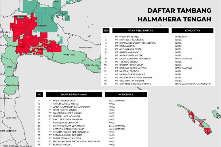 Pulau Halmahera, terutama, Halmahera Tengah dan Timur yang menjadi area terbanyak Suku O’fongana Manyawa berubah jadi tambang nikel. Jatam mencatat, ada 61 izin tambang nikel tersebar di dua kabupaten itu dengan luas konsesi 206.028,05 hektar.