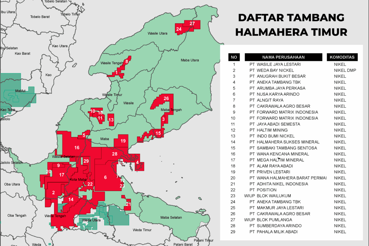 WKM memiliki konsesi 24.700 hektar, terbesar kedua di Pulau Halmahera setelah PT Weda Bay Nikel (45.065 hektar). Konsesi AJP seluas 1.818,47 hektar.