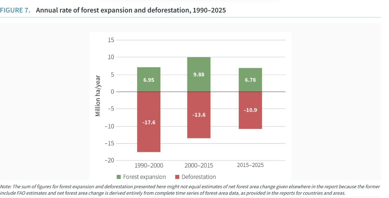 Laju deforestasi menurun dari 17,6 juta hektar (1990–2000) menjadi 10,9 juta hektar per tahun (2015–2025). Masalahnya, di waktu sama, laju perluasan hutan baru juga menurun, dari 9,88 juta hektar per tahun (2000–2015) menjadi 6,78 juta hektar (2015–2025).