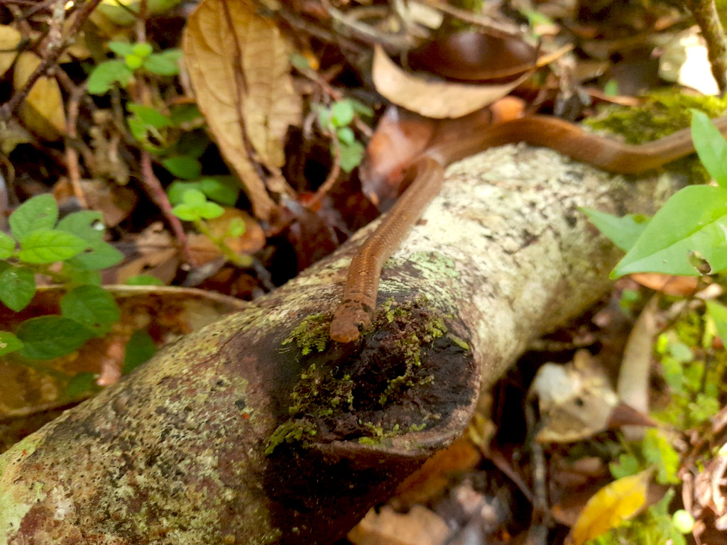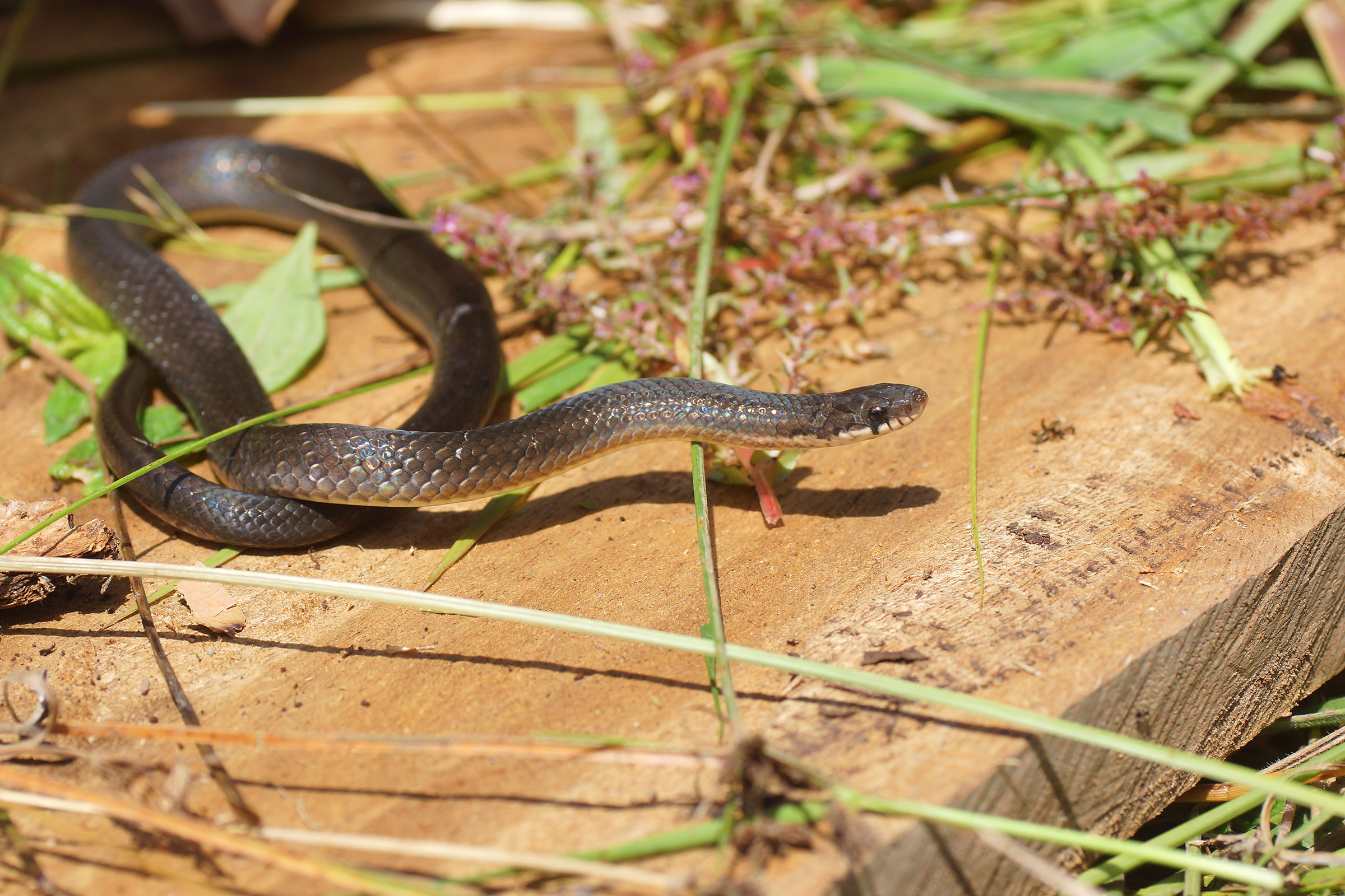 Tubuh reptil melata itu terlihat di antara semak basah. Sekilas mirip cacing tanah, namun pola sisiknya berbeda.