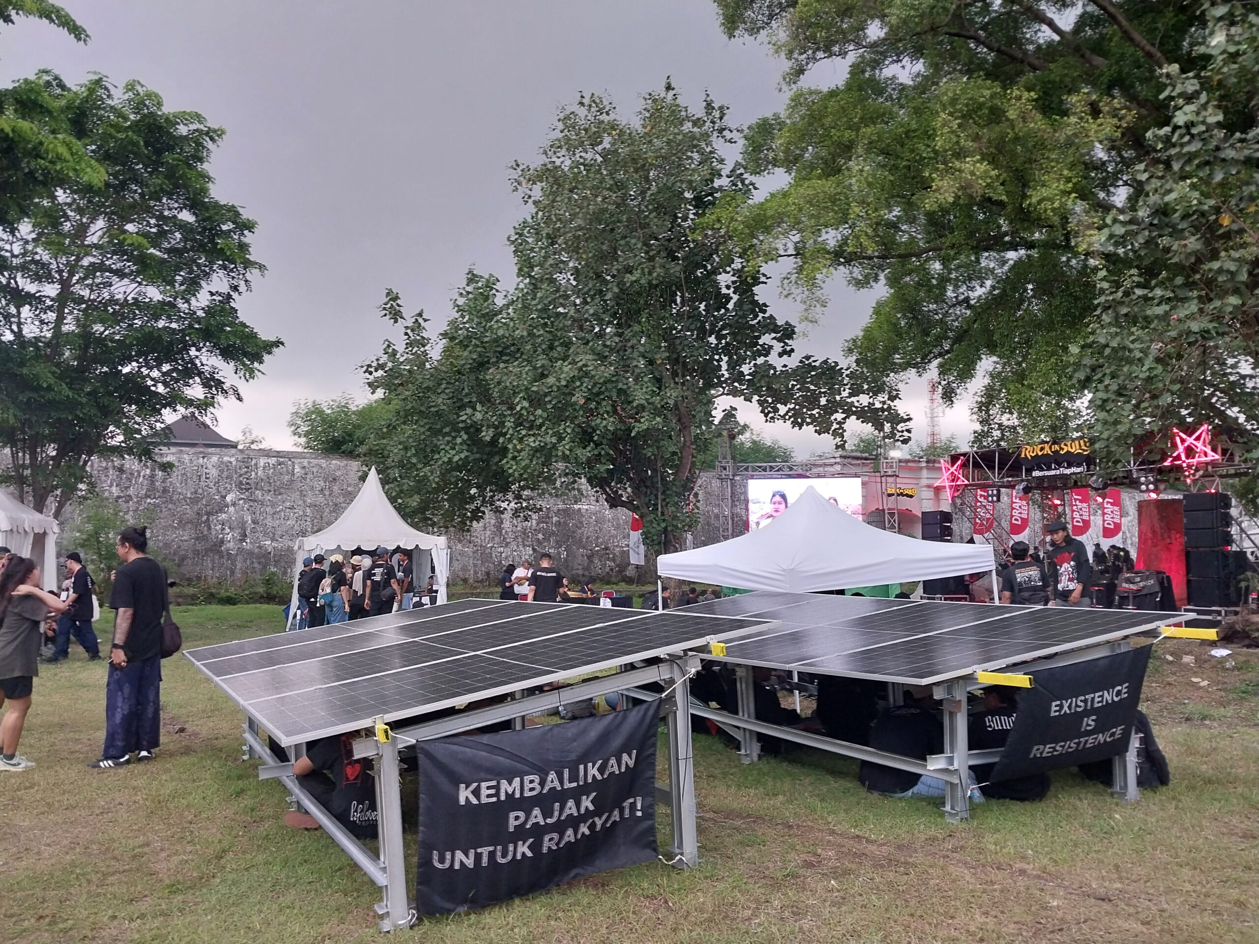 Salah satu hal menarik lainnya di ajang musik Rock in Solo 2025 ialah adanya solar panel untuk kebutuhan energi gawai para penonton musik. Memang kapasitasnya tak besar, tapi harapannya dapat mengedukasi pengunjung.
