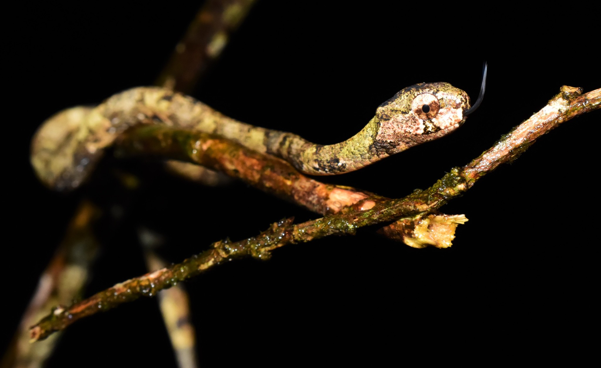 Sekitar pukul delapan hingga sembilan malam, di tengah jalur observasi, dia melihat sesuatu yang nyaris mencolok. Di antara serasah daun dan ranting, tampak sosok mirip kayu kering. Saat diamati lebih dekat, ternyata seekor ular kecil dengan pola tubuh samar.